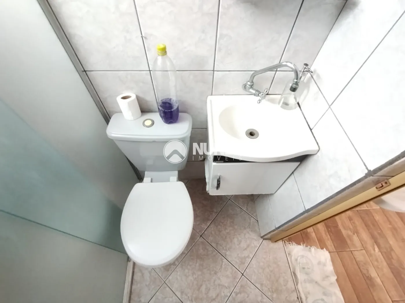 Banheiro: com box de vidro e gabinete