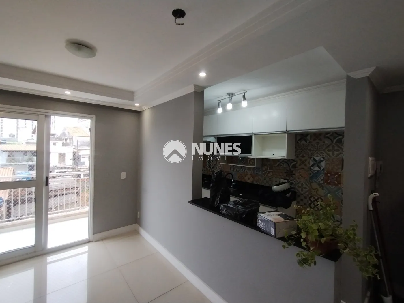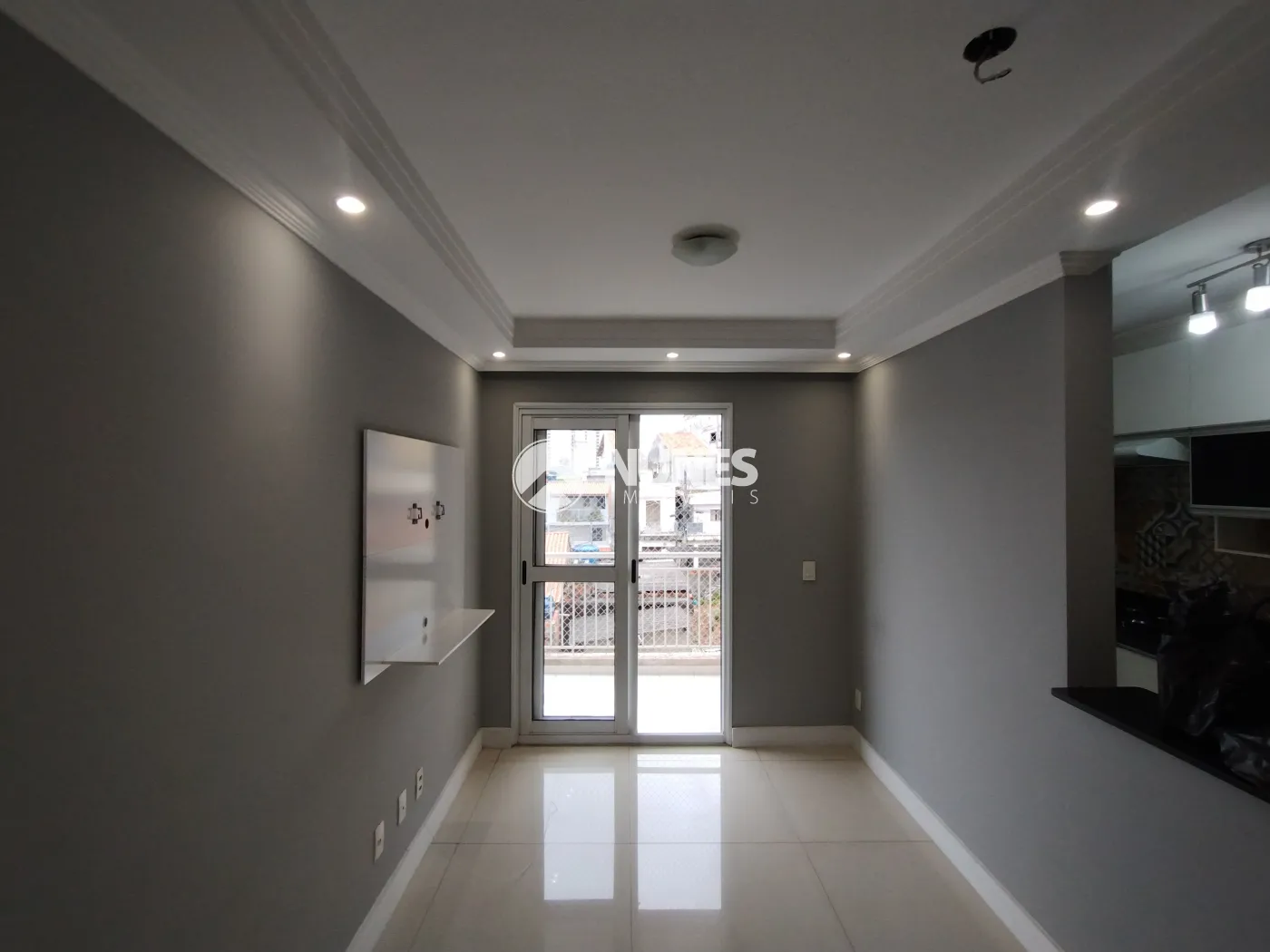 Sala com sacada gourmet e painel de TV (piso porcelanato)
