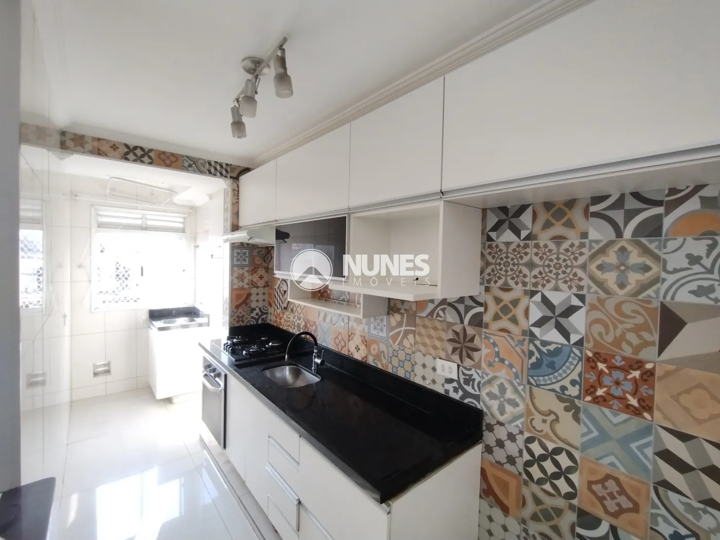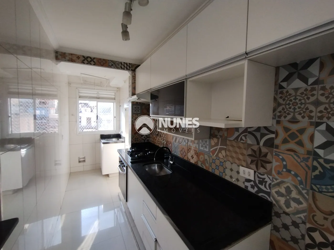 Cozinha com armários planejados, cooktop, forno e depurador (piso porcelanato)