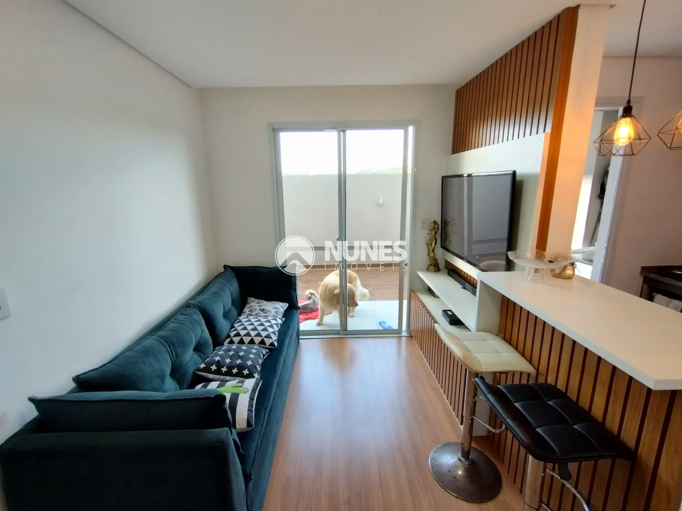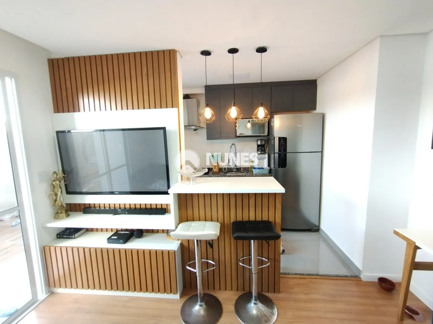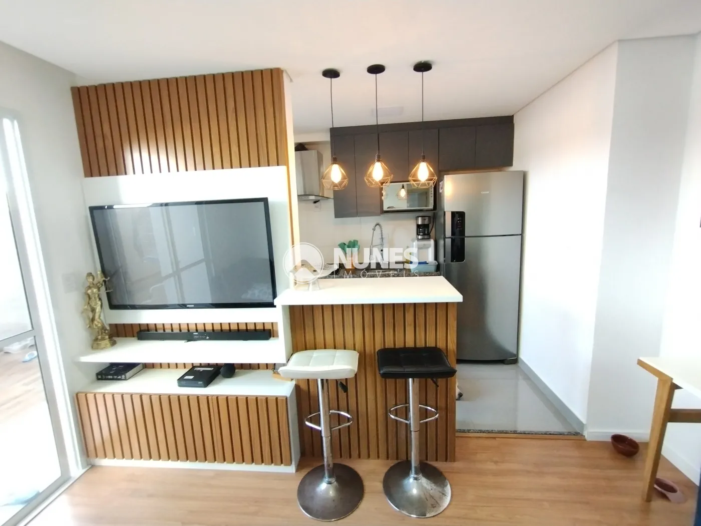 Sala c/ painel, rack de tv e balcão (piso laminado)