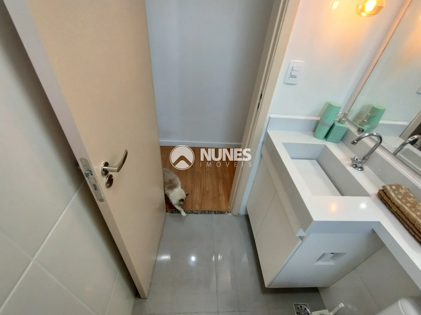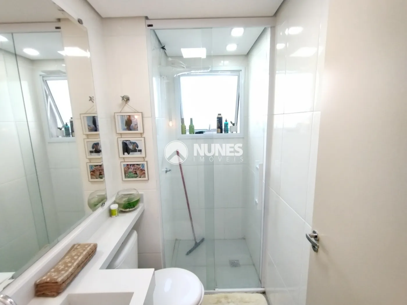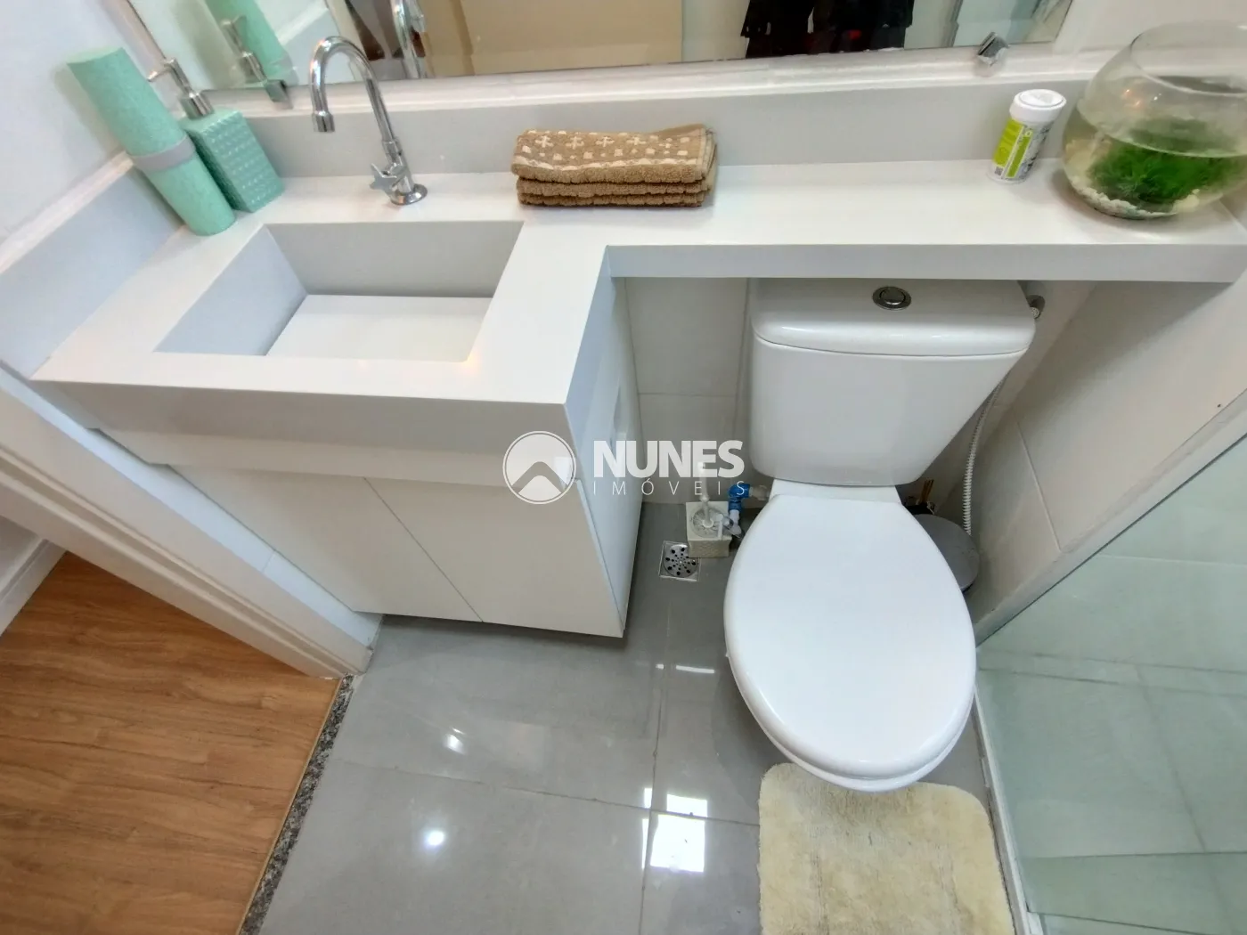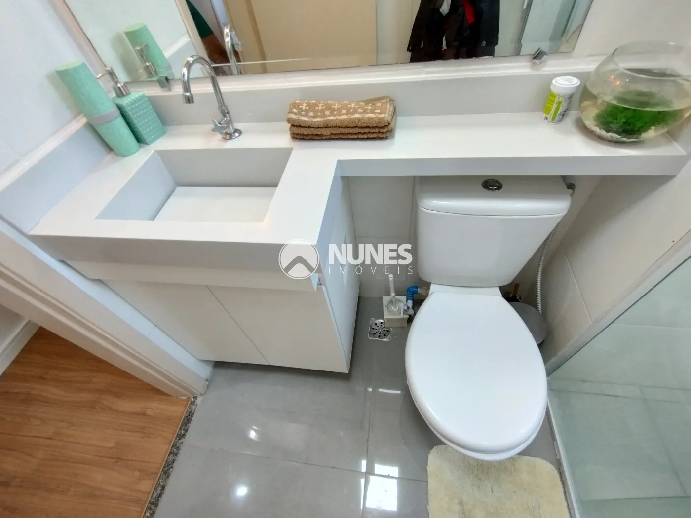 Banheiro c/ box de vidro temperado liso e gabinete (piso cerâmica)
