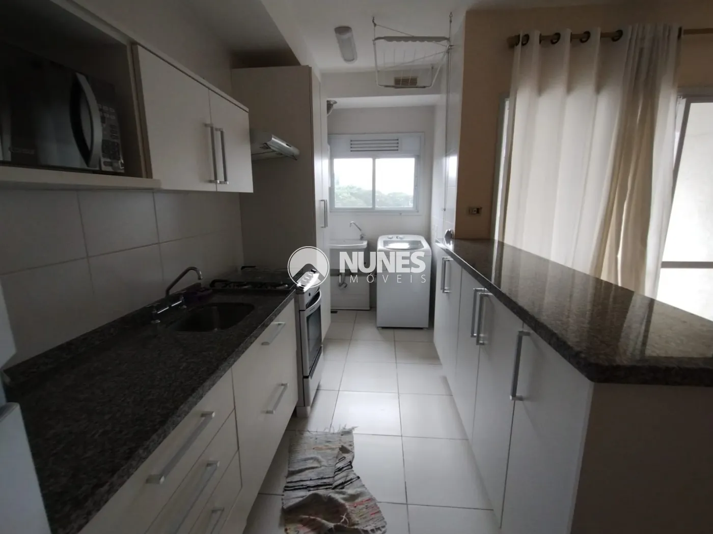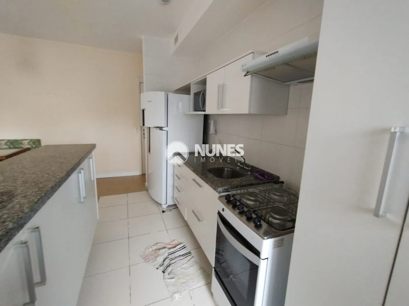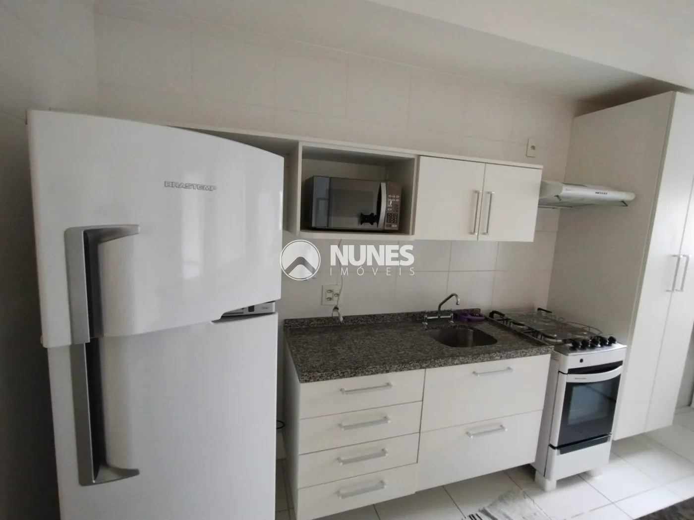 Cozinha com armários, balcão, geladeira, micro-ondas, e fogão (piso cerâmica)