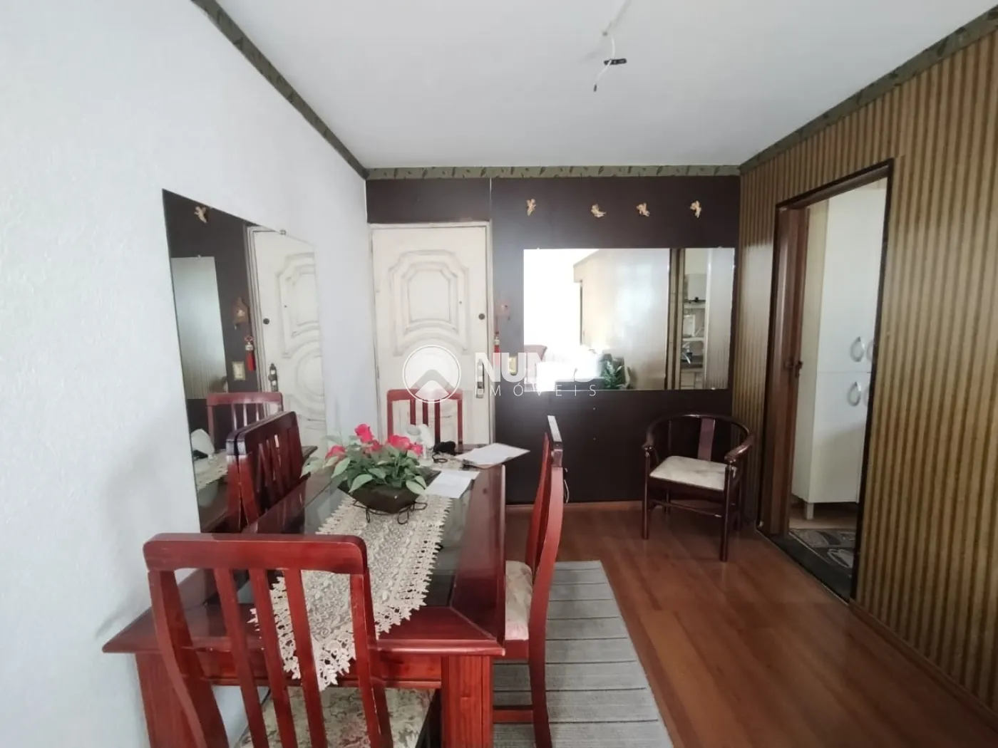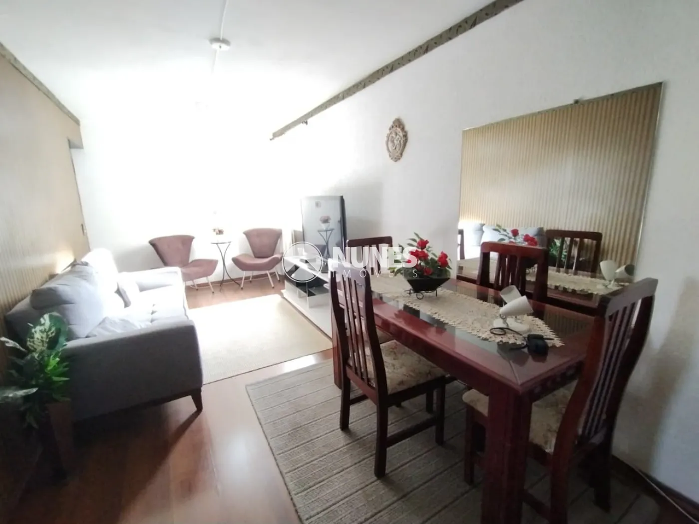 Sala ampla com sofá, rack, mesa com cadeiras e TV (piso laminado)