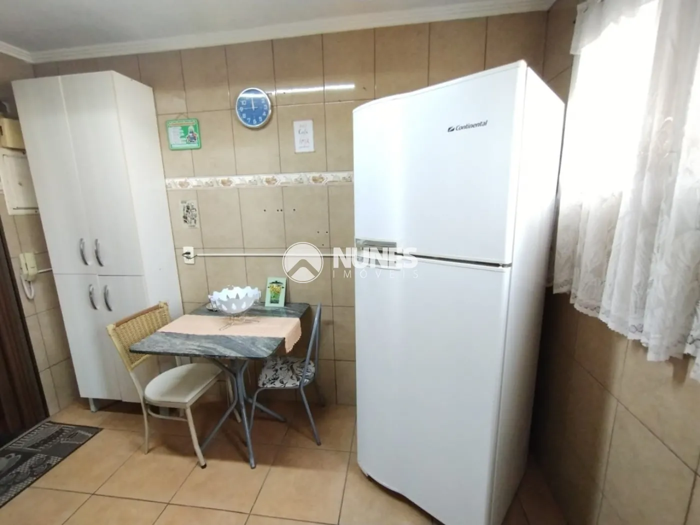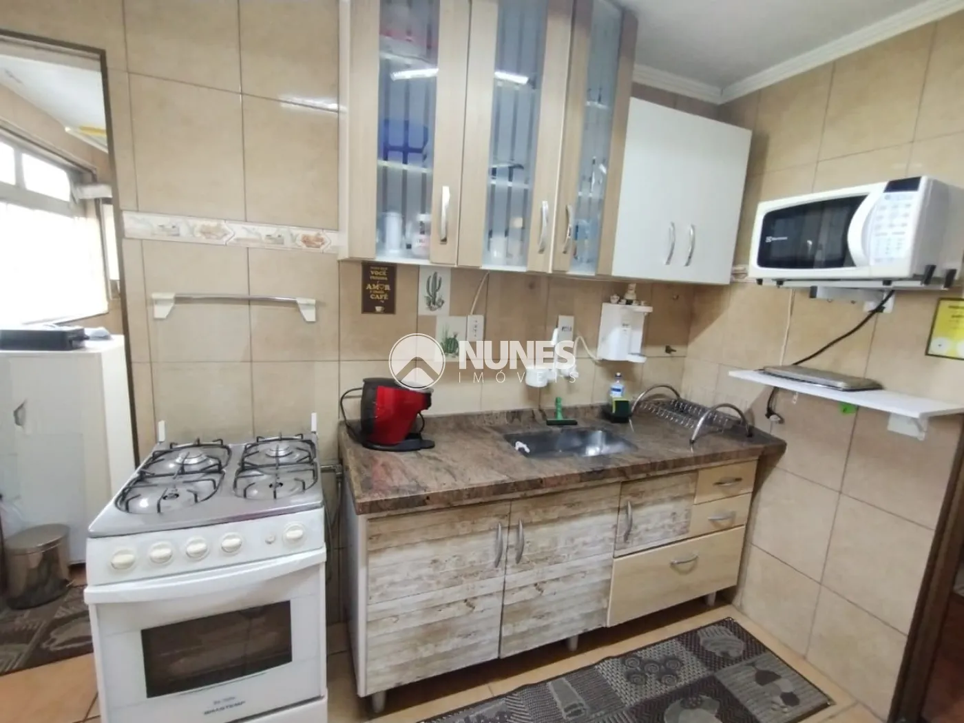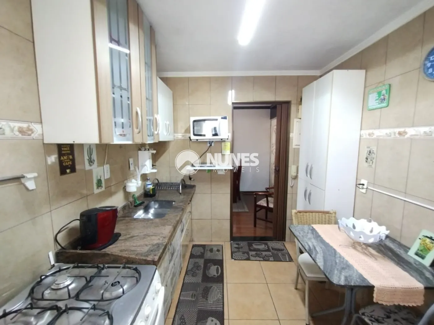 Cozinha com armário, fogão, geladeira, micro-ondas e mesa (piso cerâmica)
