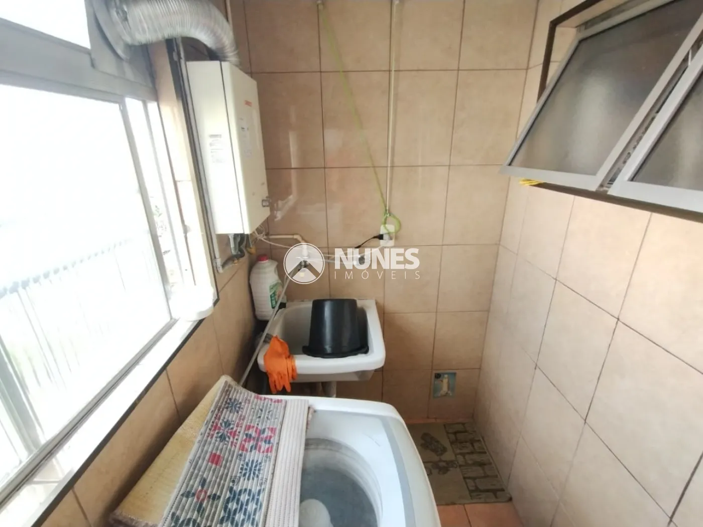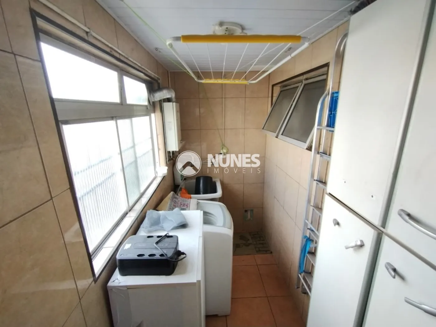 Lavanderia com máquina de lavar, armário e aquecedor (piso cerâmica)