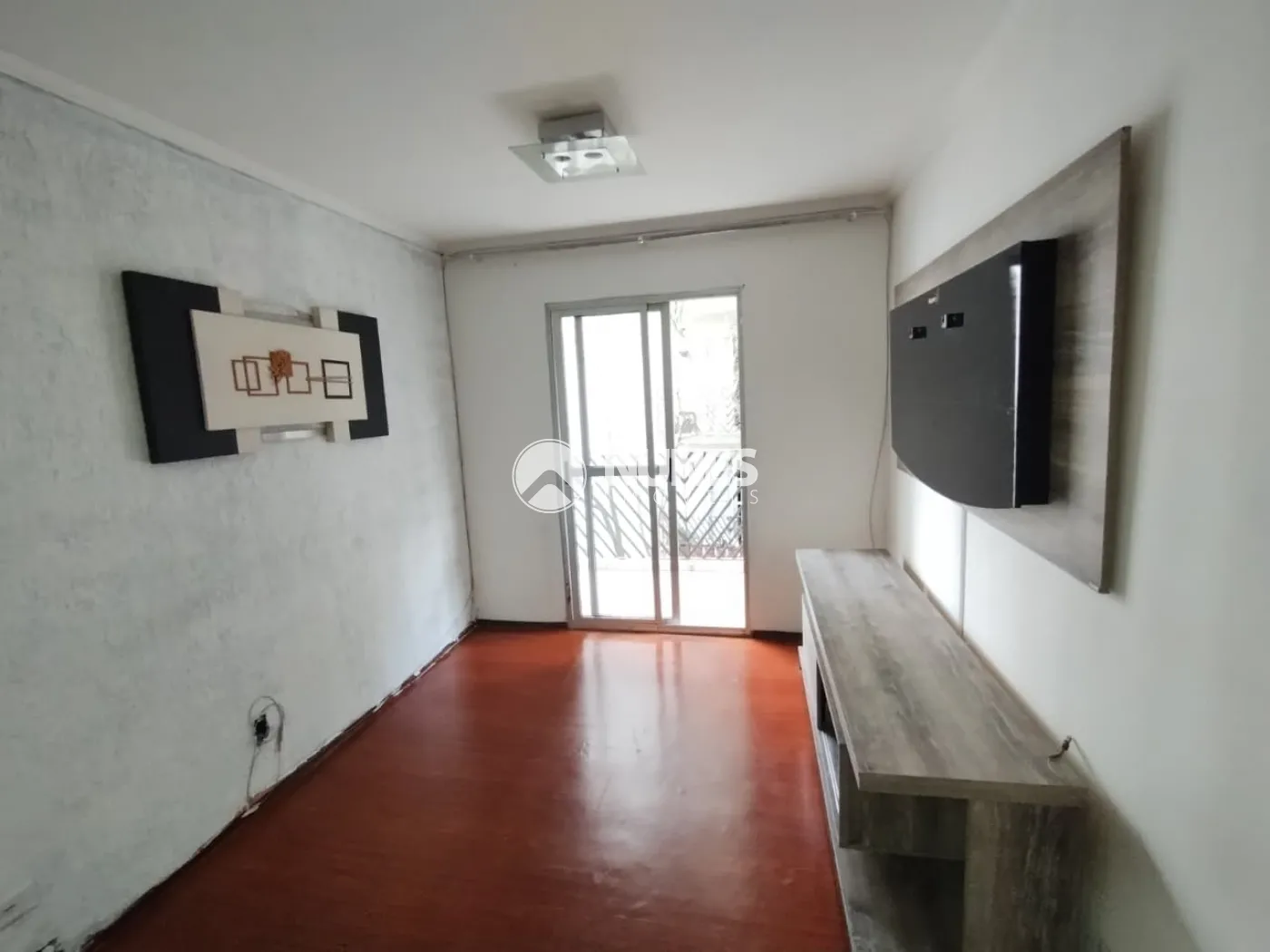 Sala com painel, rack (piso vinílico)