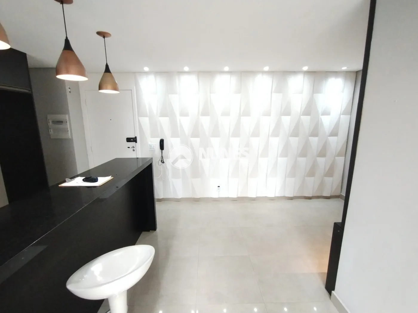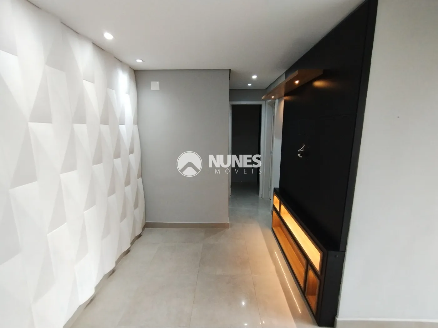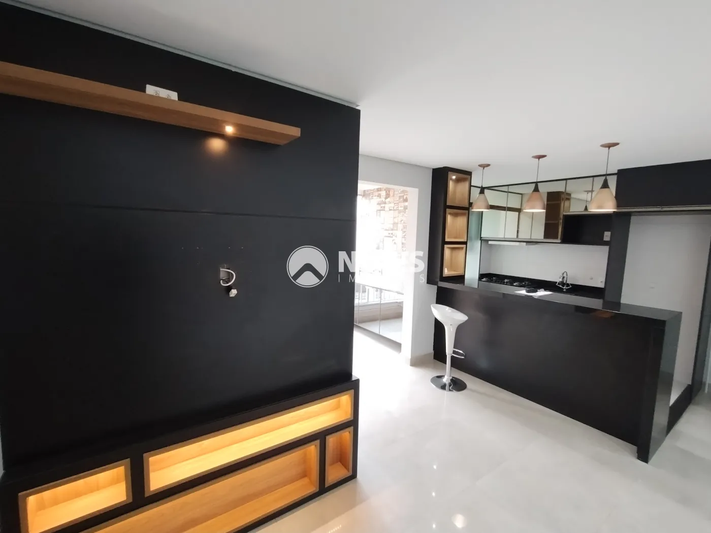 Sala ampla com painel e rack (piso porcelanato)