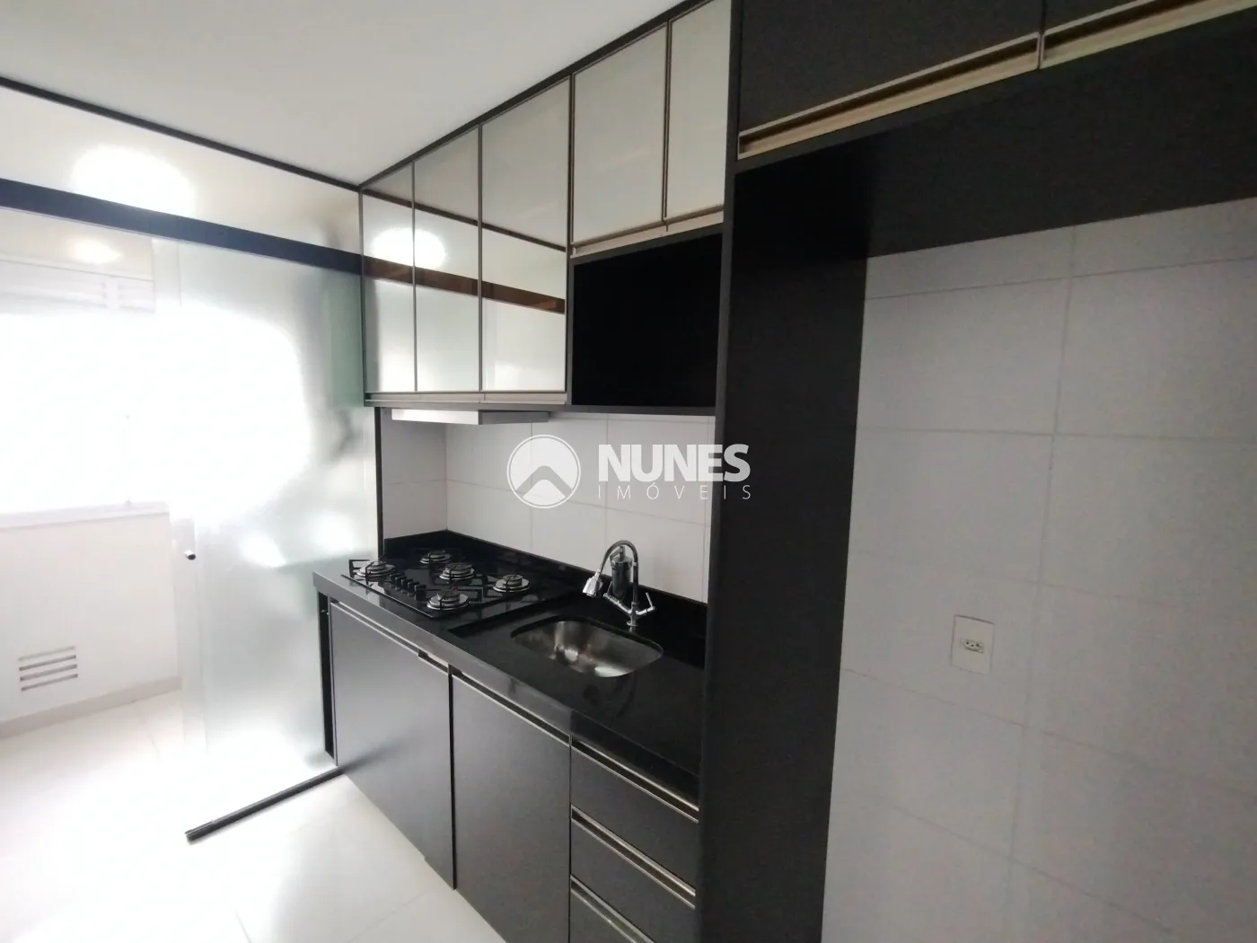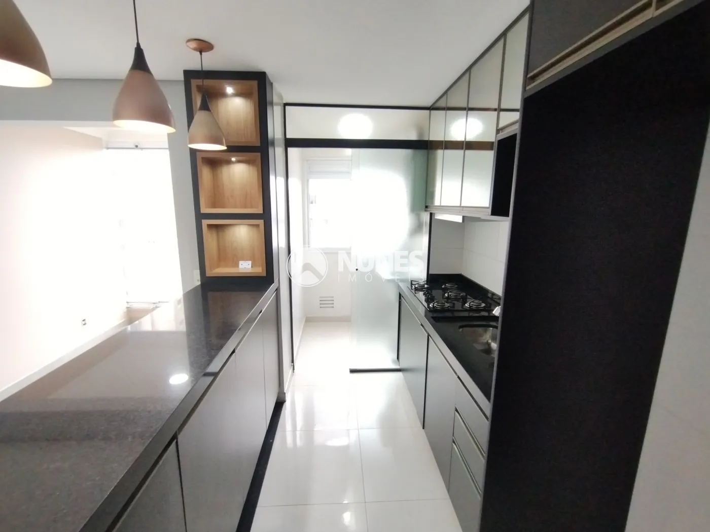 Cozinha com armários planejados, fogão e balcão (piso porcelanato)