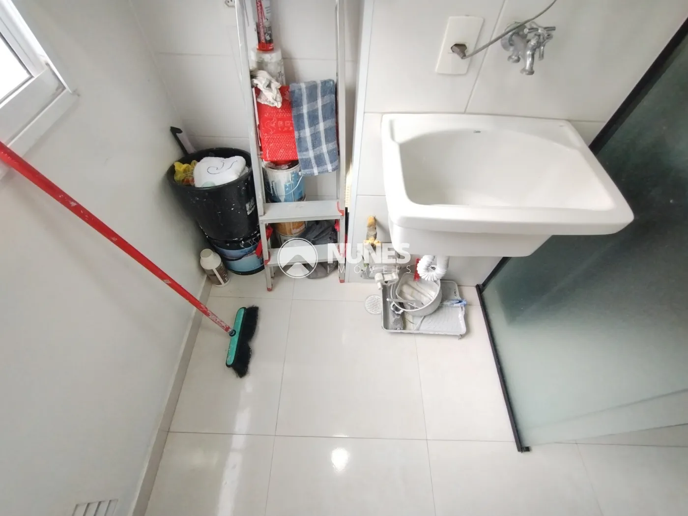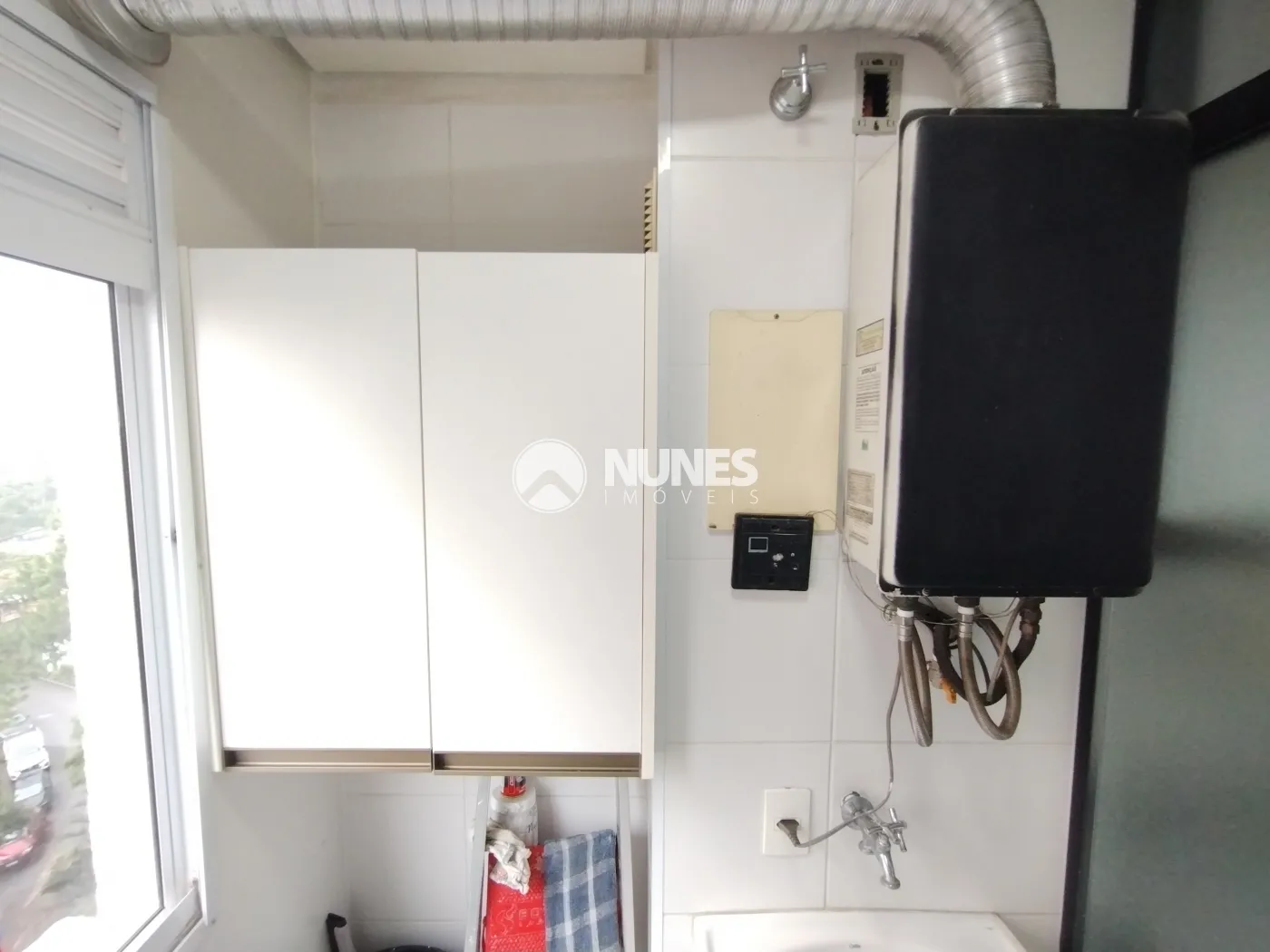 Lavanderia com armário e aquecedor (piso porcelanato)