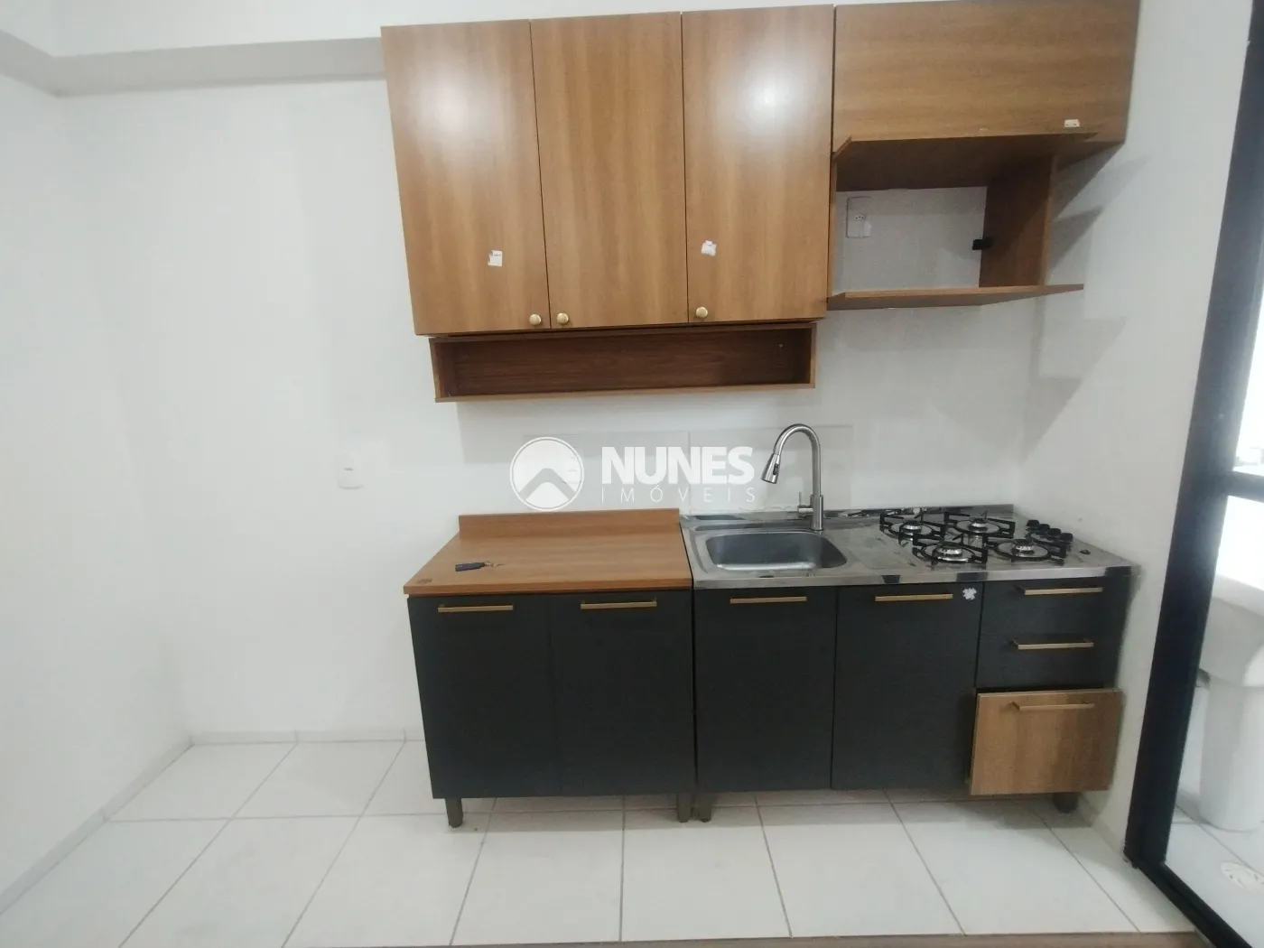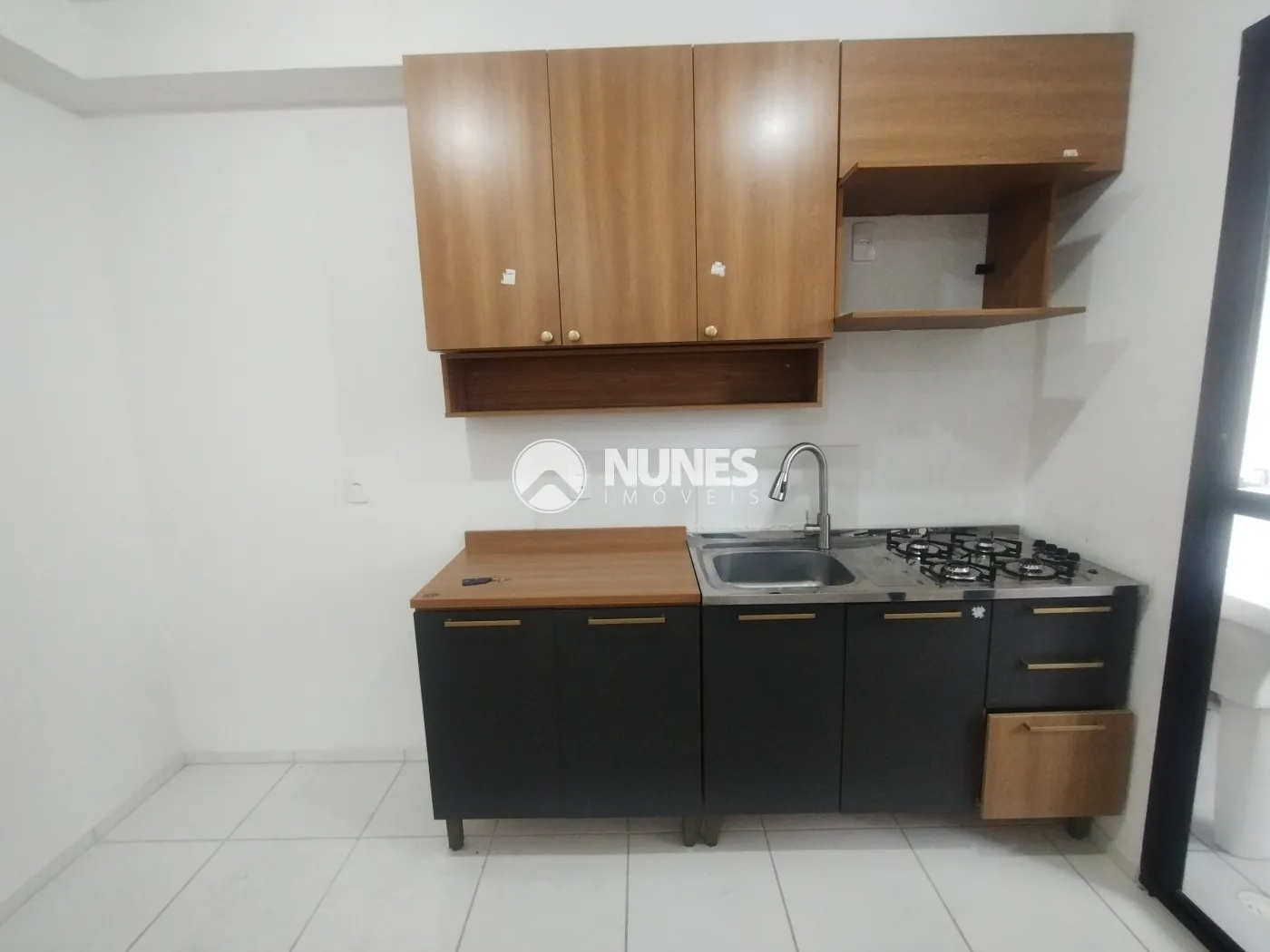 Cozinha com armários, pia com fogão e gabinete (piso cerâmica)