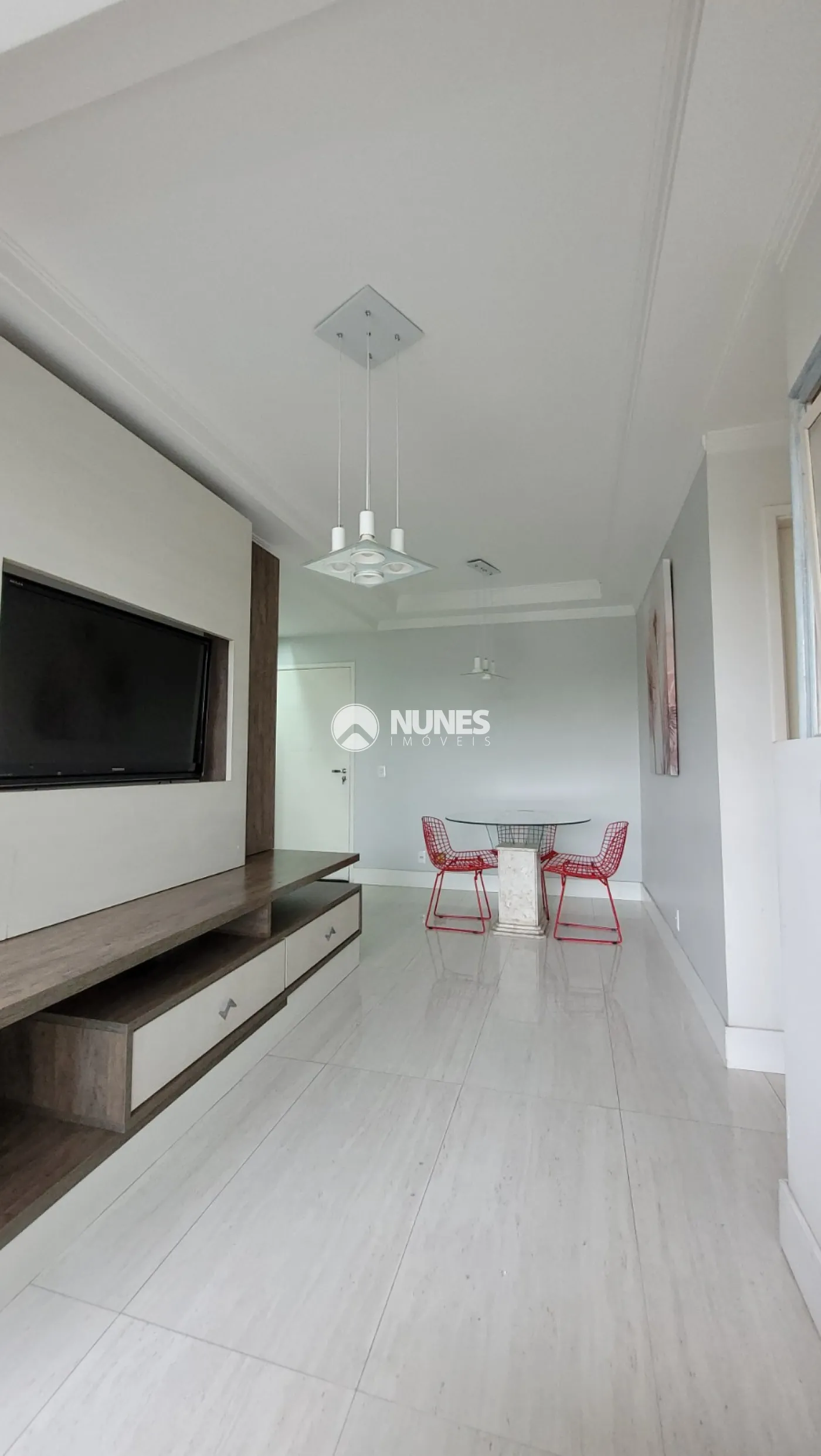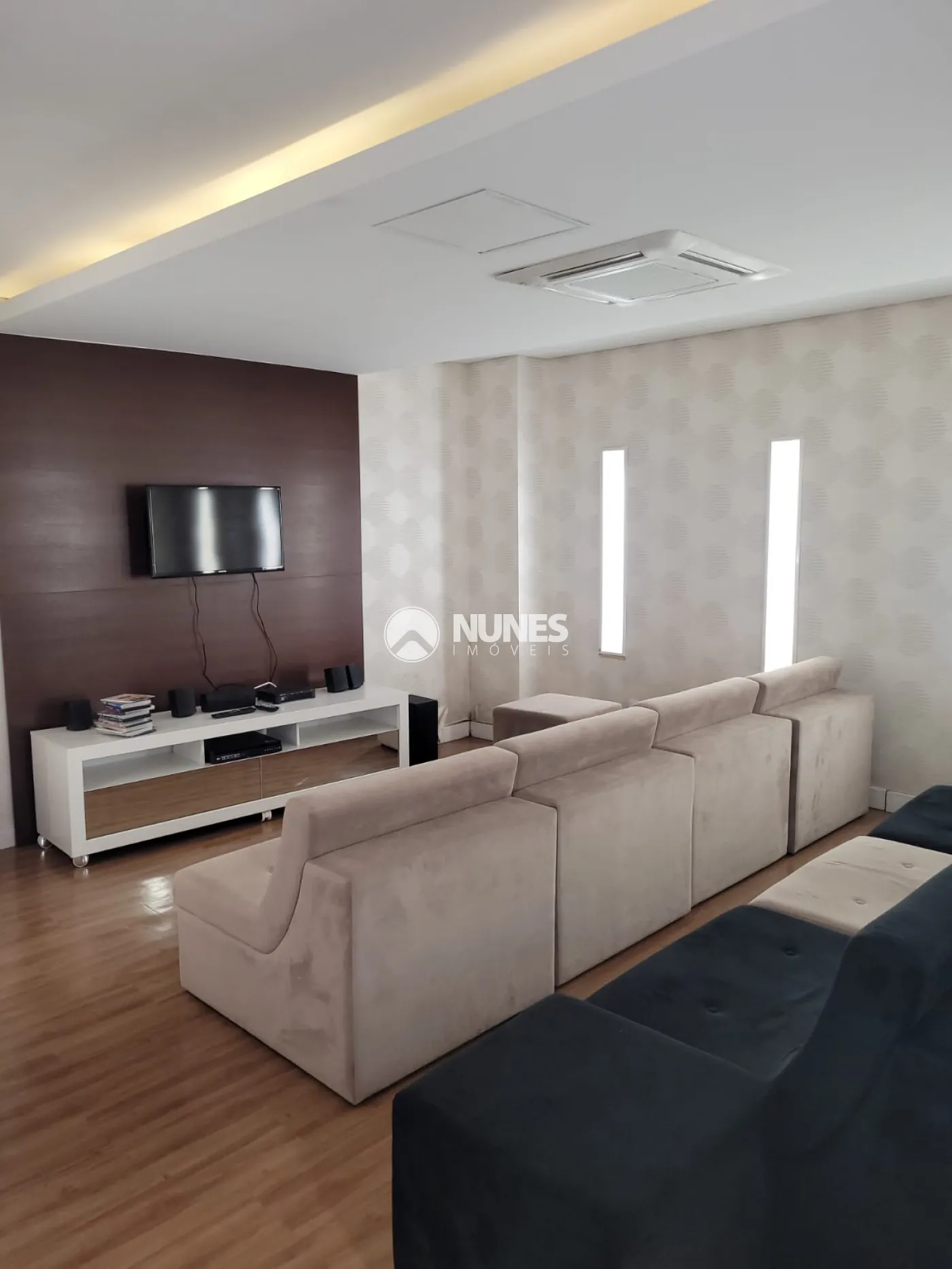 Sala: confortável com rack sendo dois ambientes