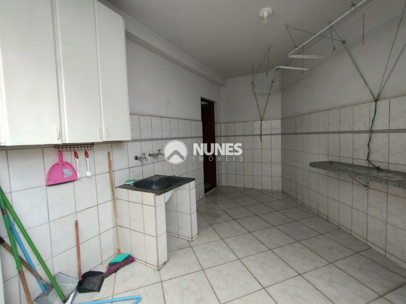 Área de serviço coberta (piso cerâmica) com armário e churrasqueira