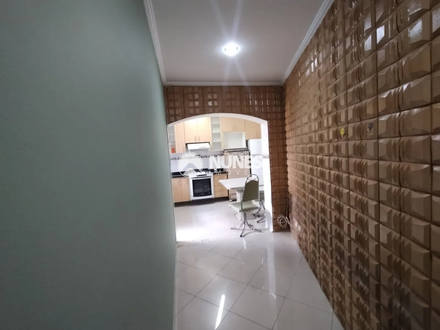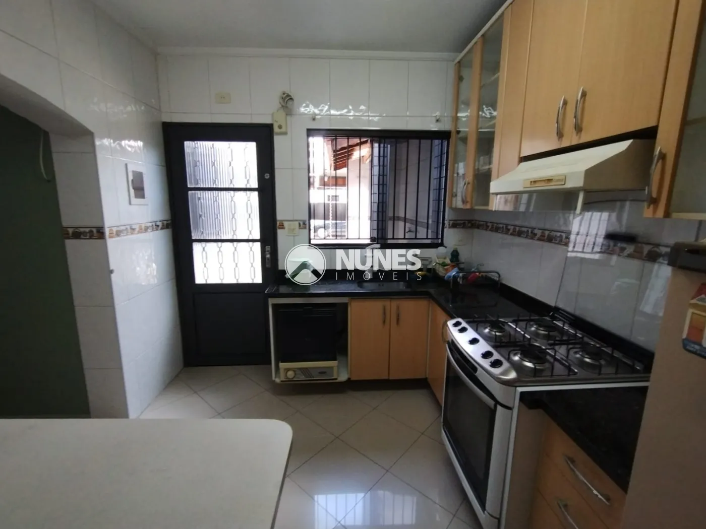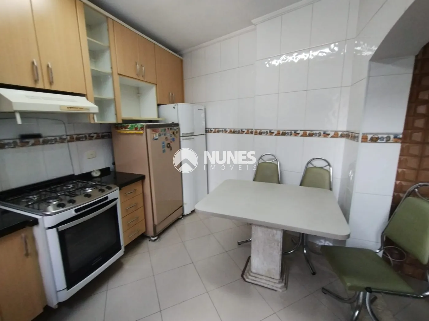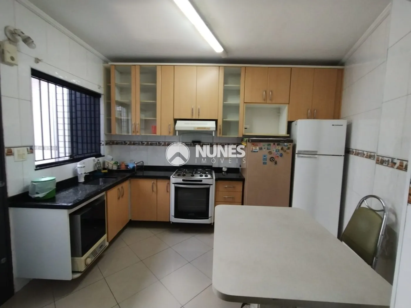 Cozinha com armários, fogão, mesa e geladeira (piso porcelanato)