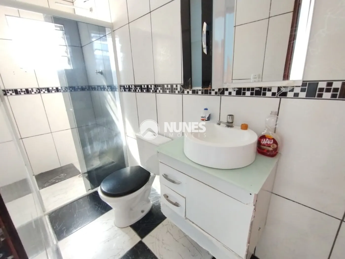 Banheiro com box e gabinete (piso porcelanato)