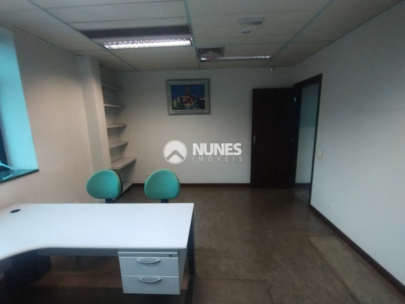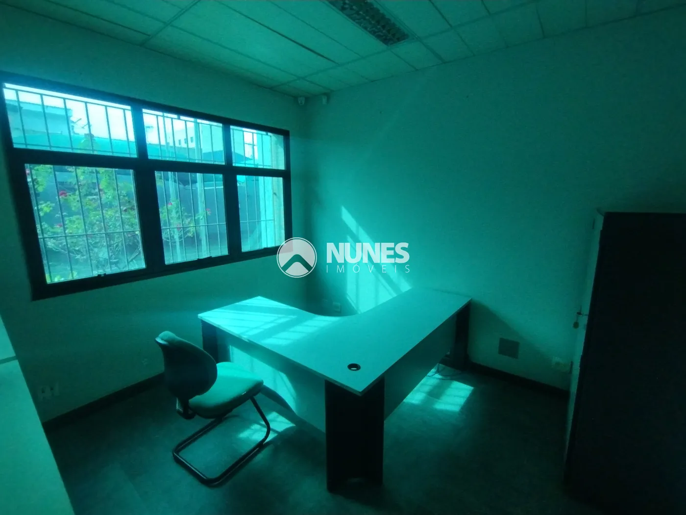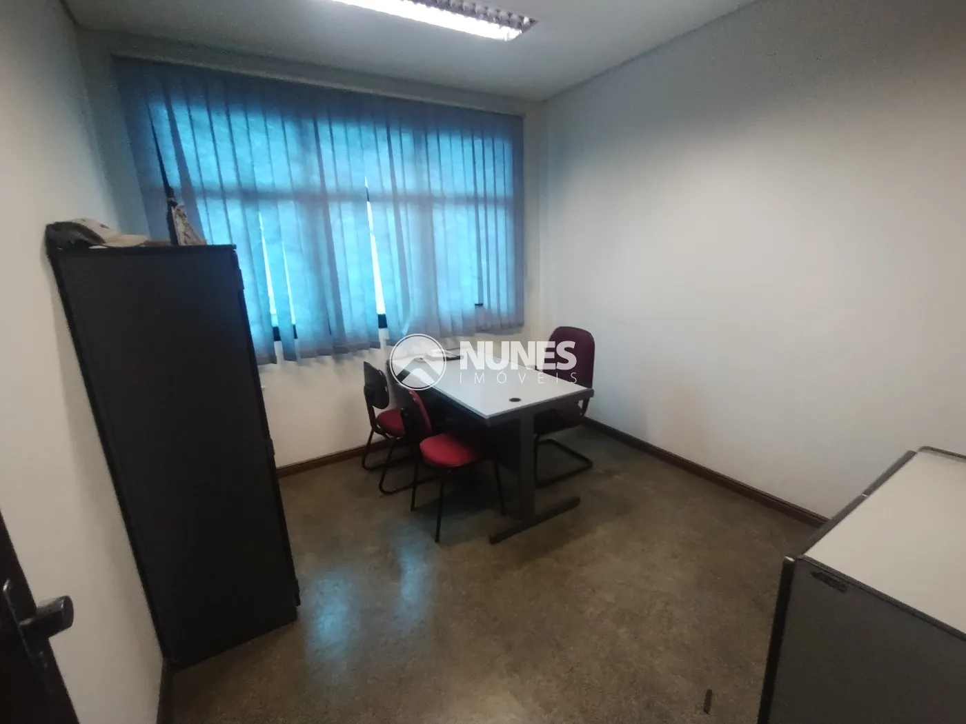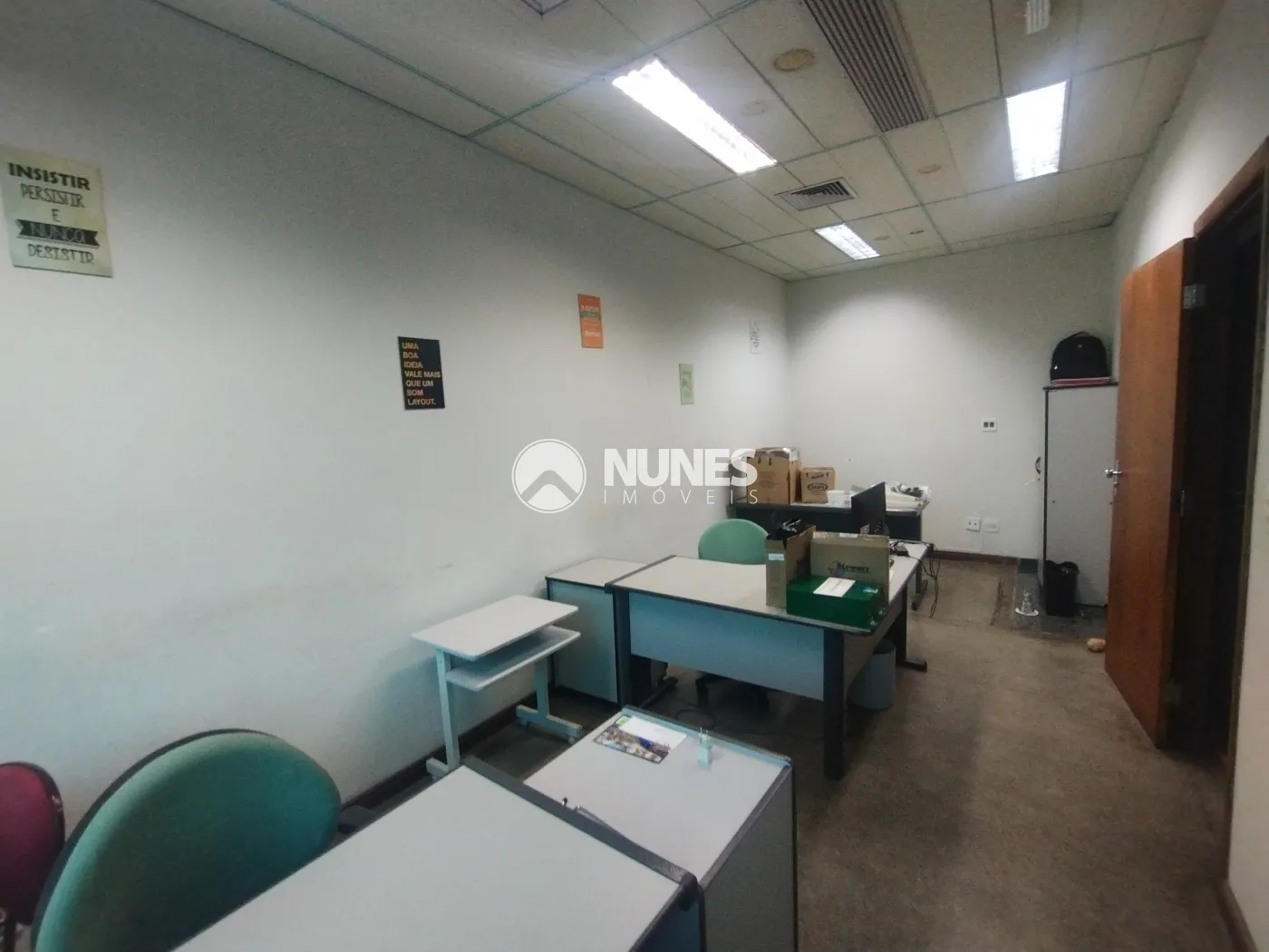 Escritório com mesa, cadeiras e armário (piso decorflex)