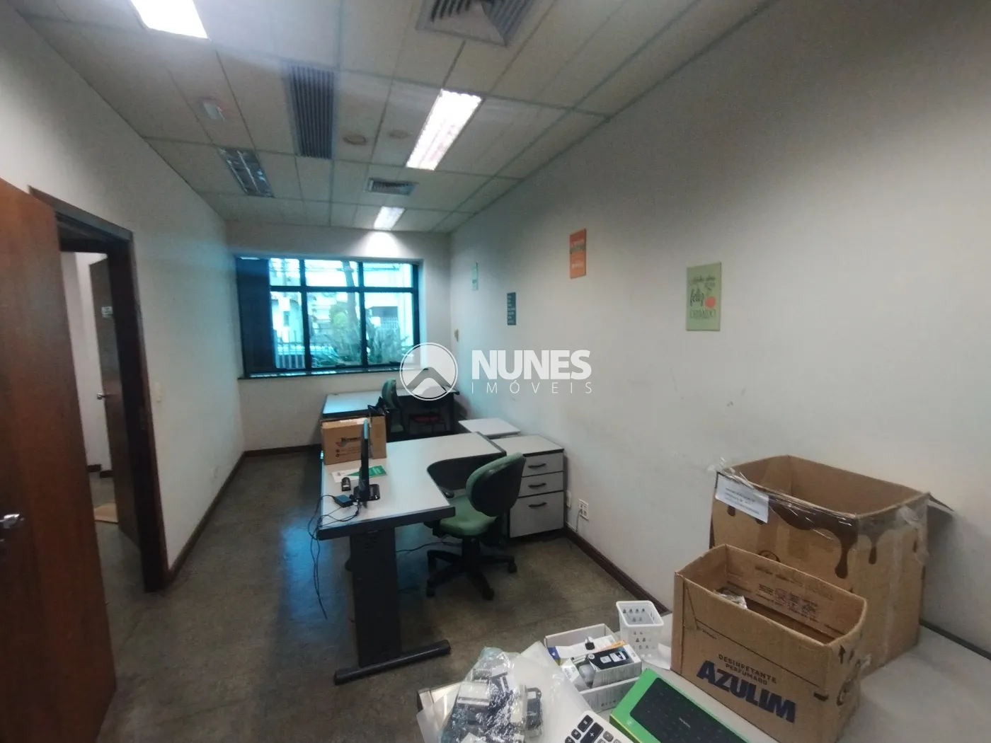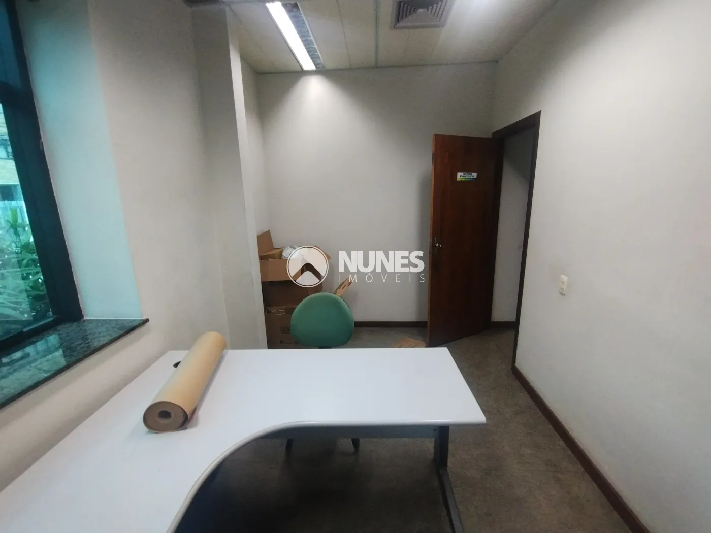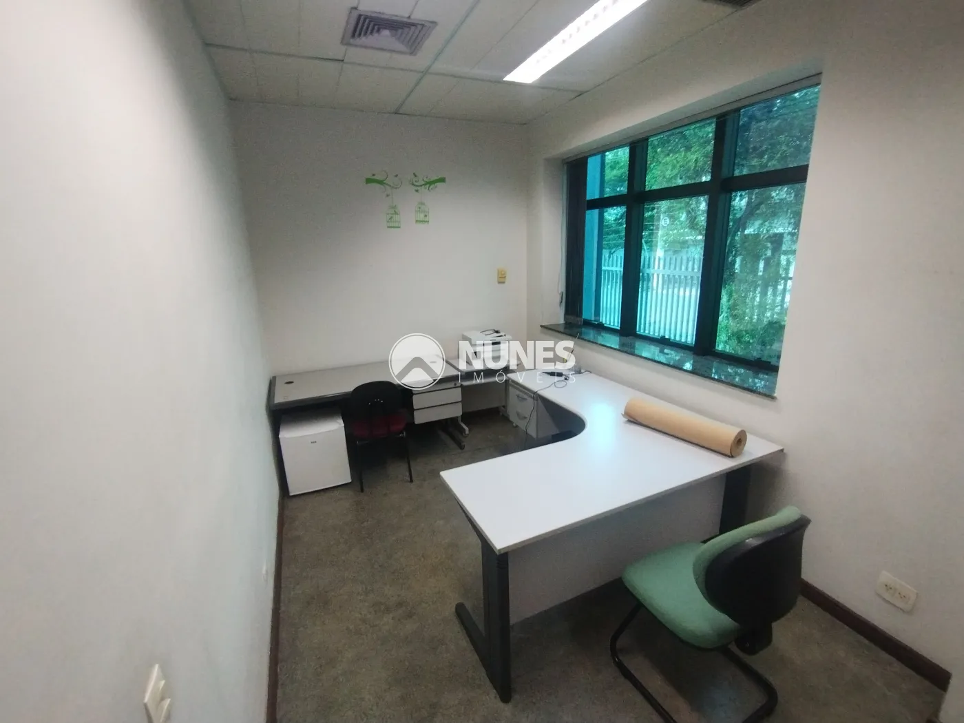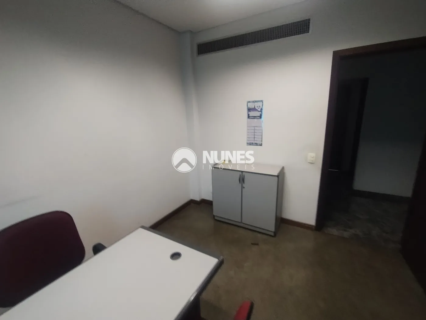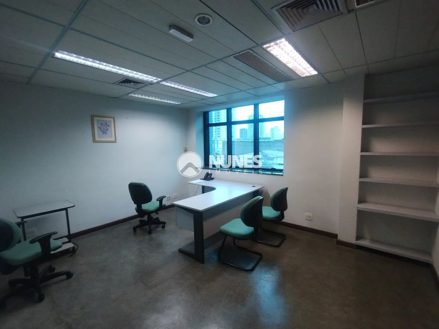 Escritório com mesa, cadeiras e armário (piso decorflex)