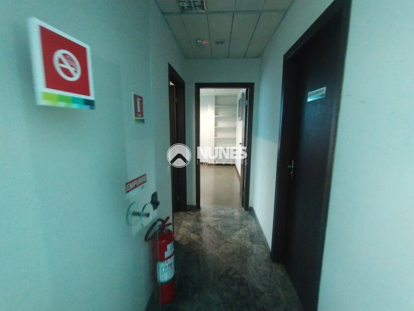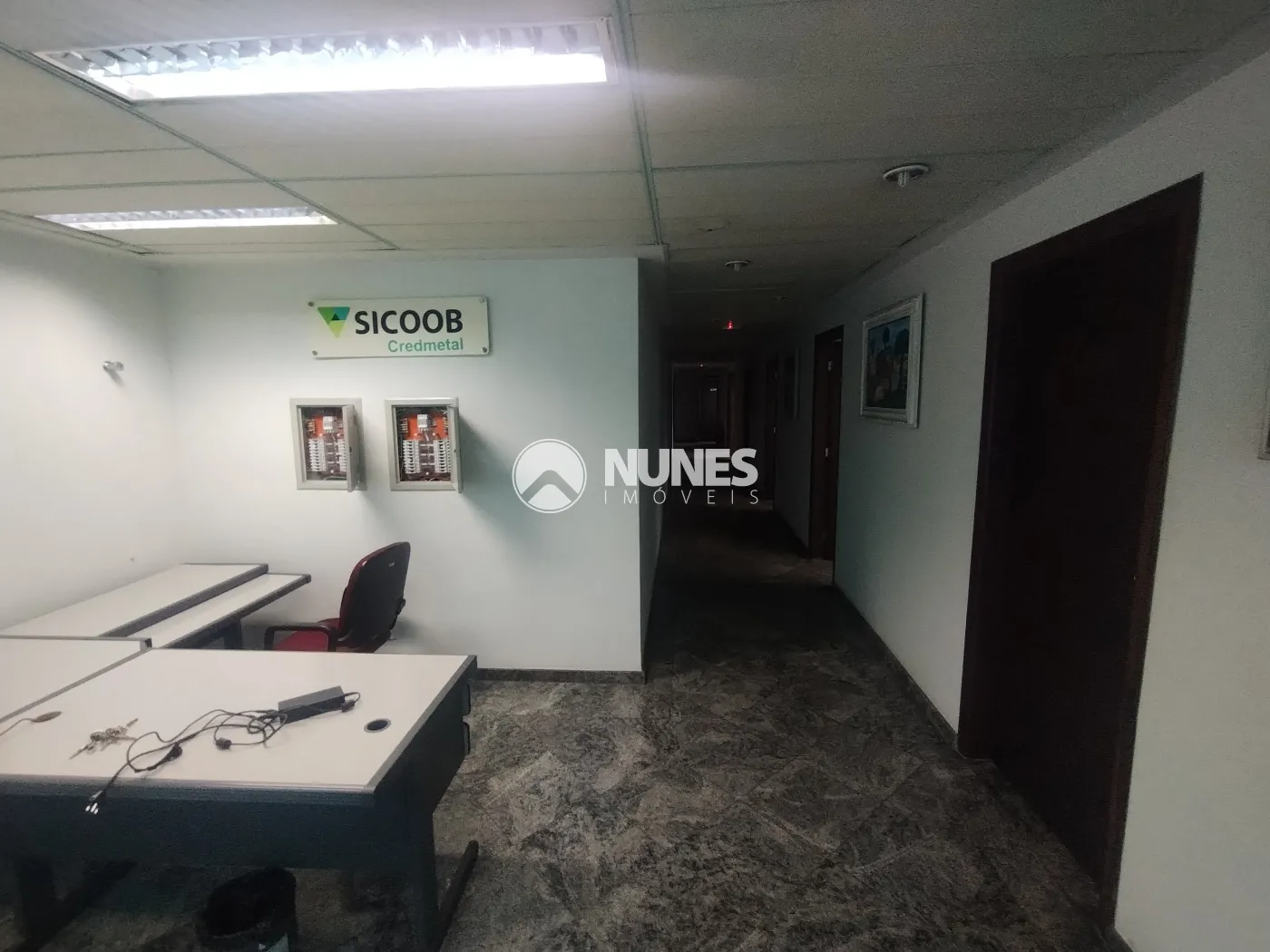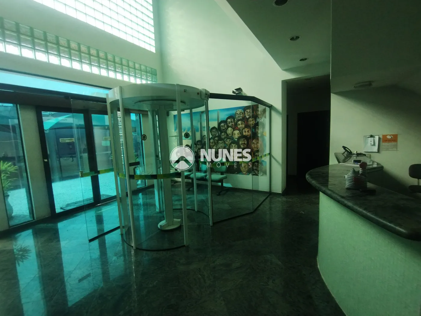 Recepção com portas giratórias de vidro e balcão (piso cerâmica)
