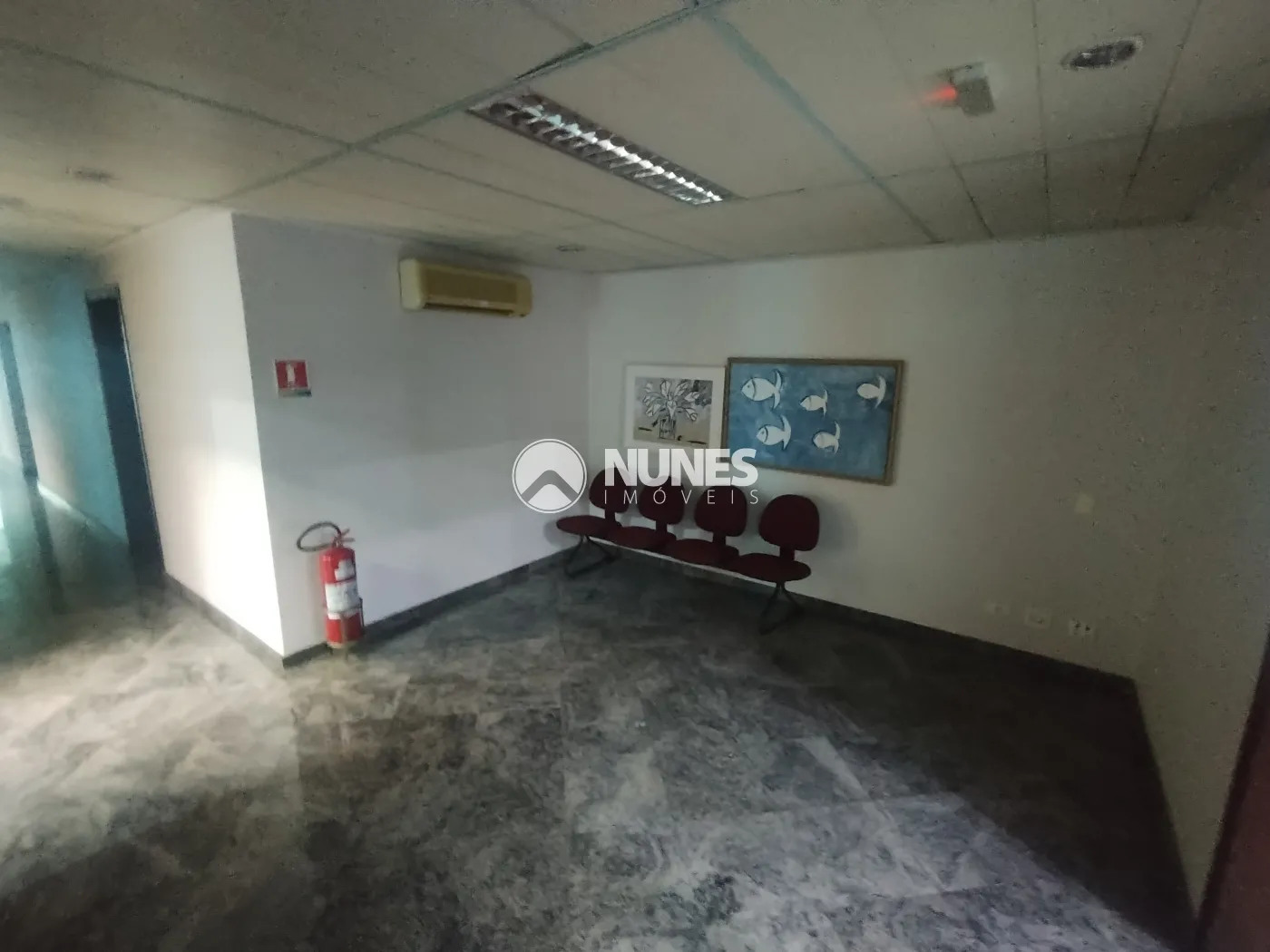 Sala de espera com cadeiras e banheiro com box de vidro (piso cerâmica)