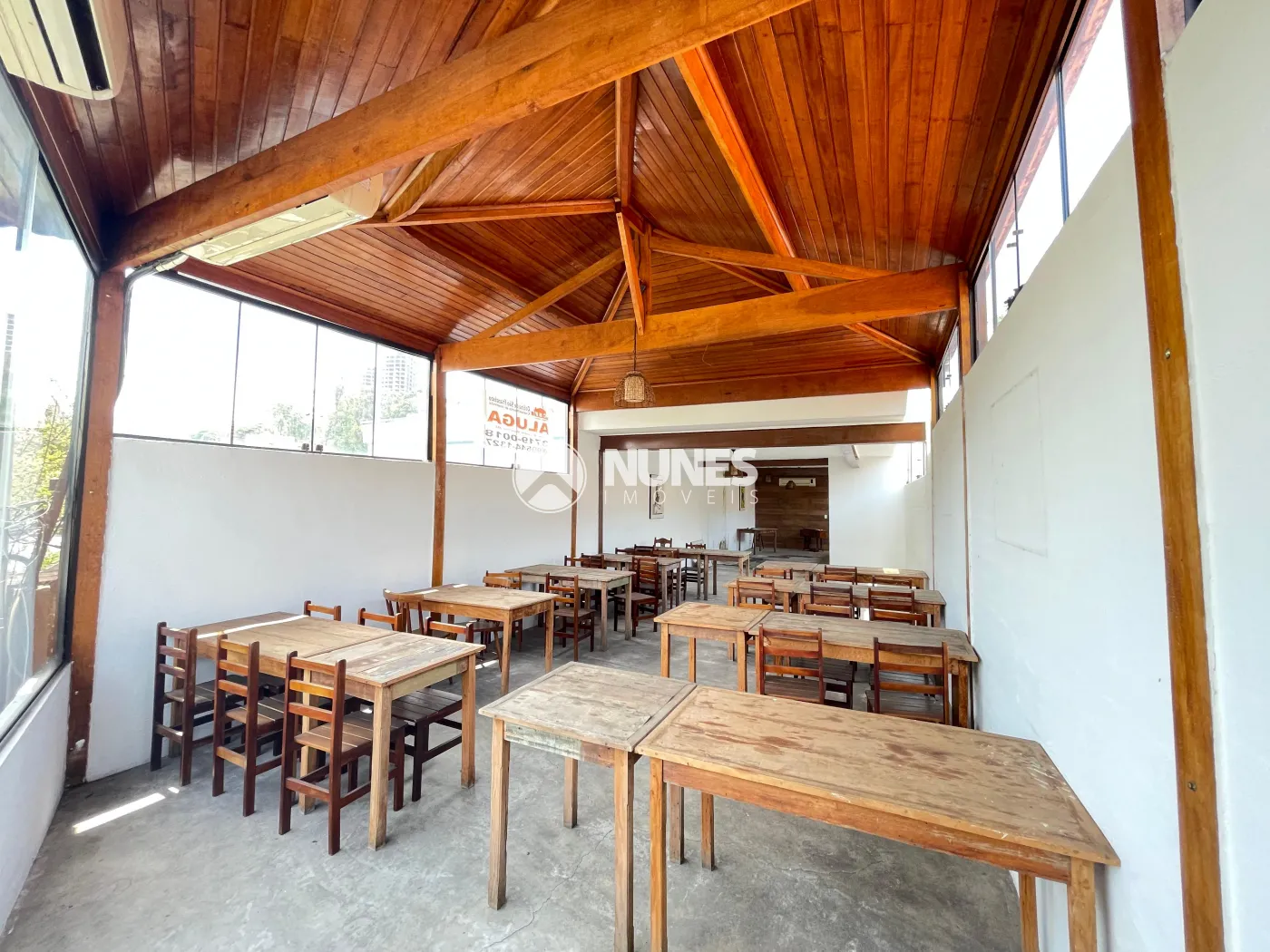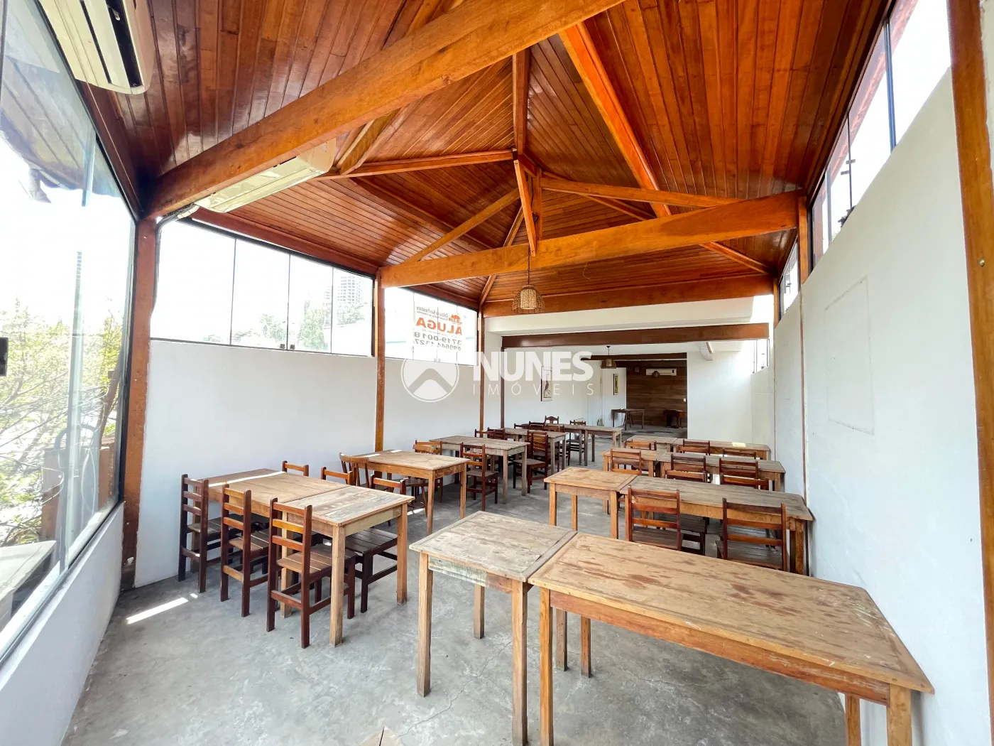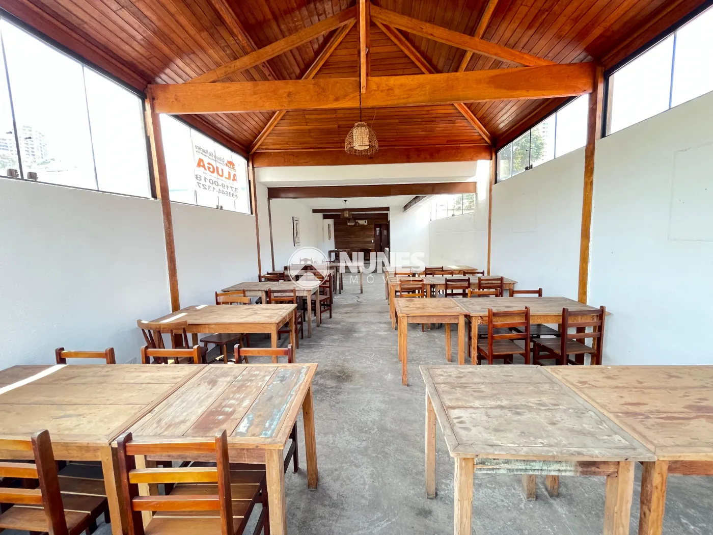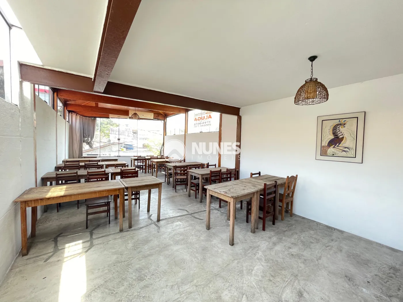 Salão 1° andar 87,09m² com mesas e cadeiras (piso cimento)