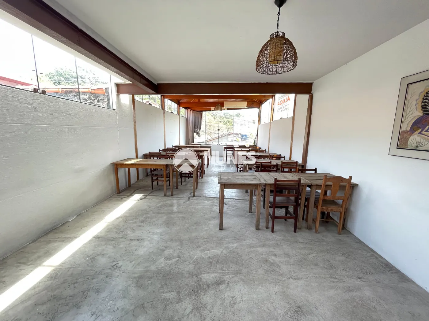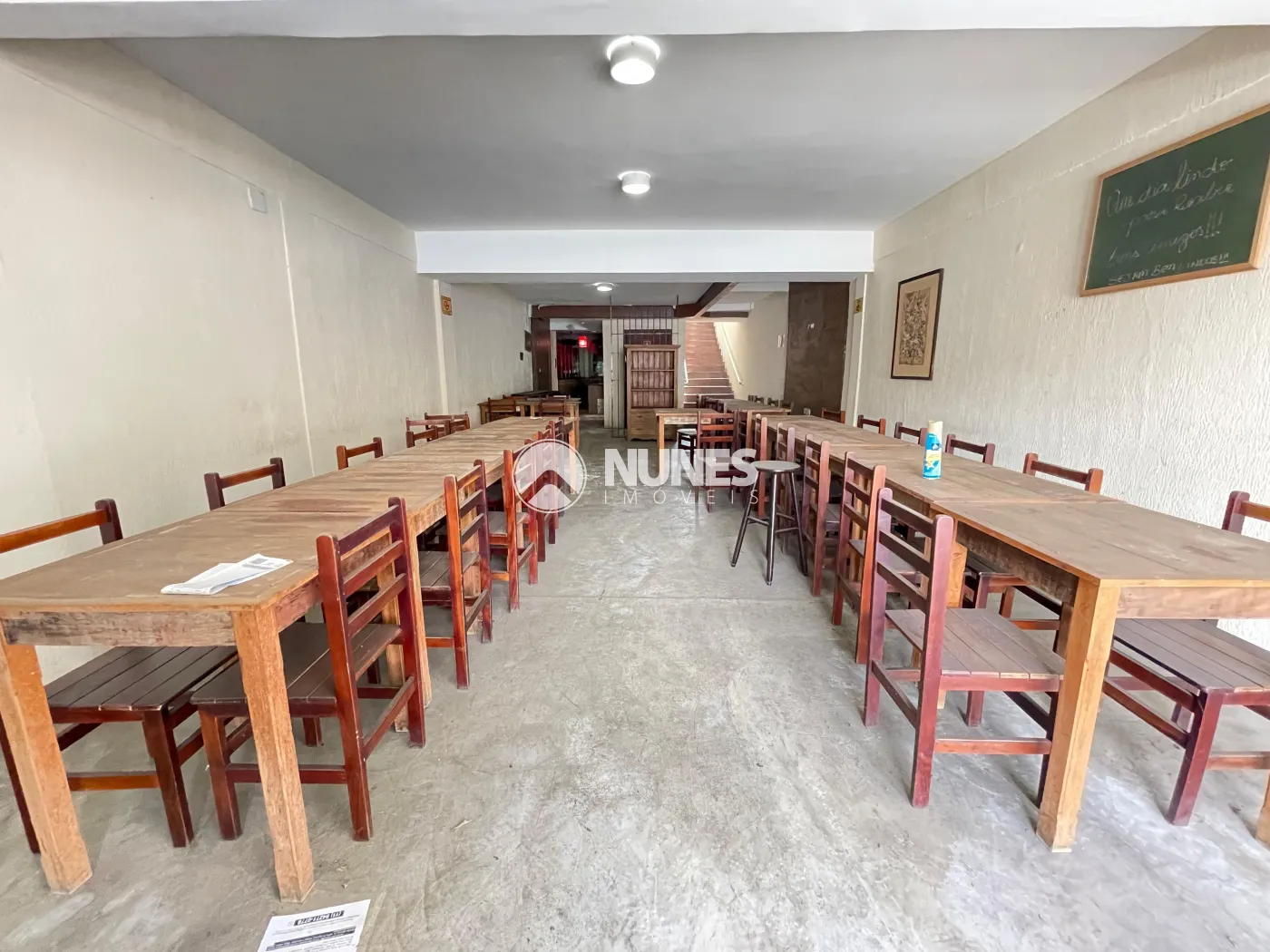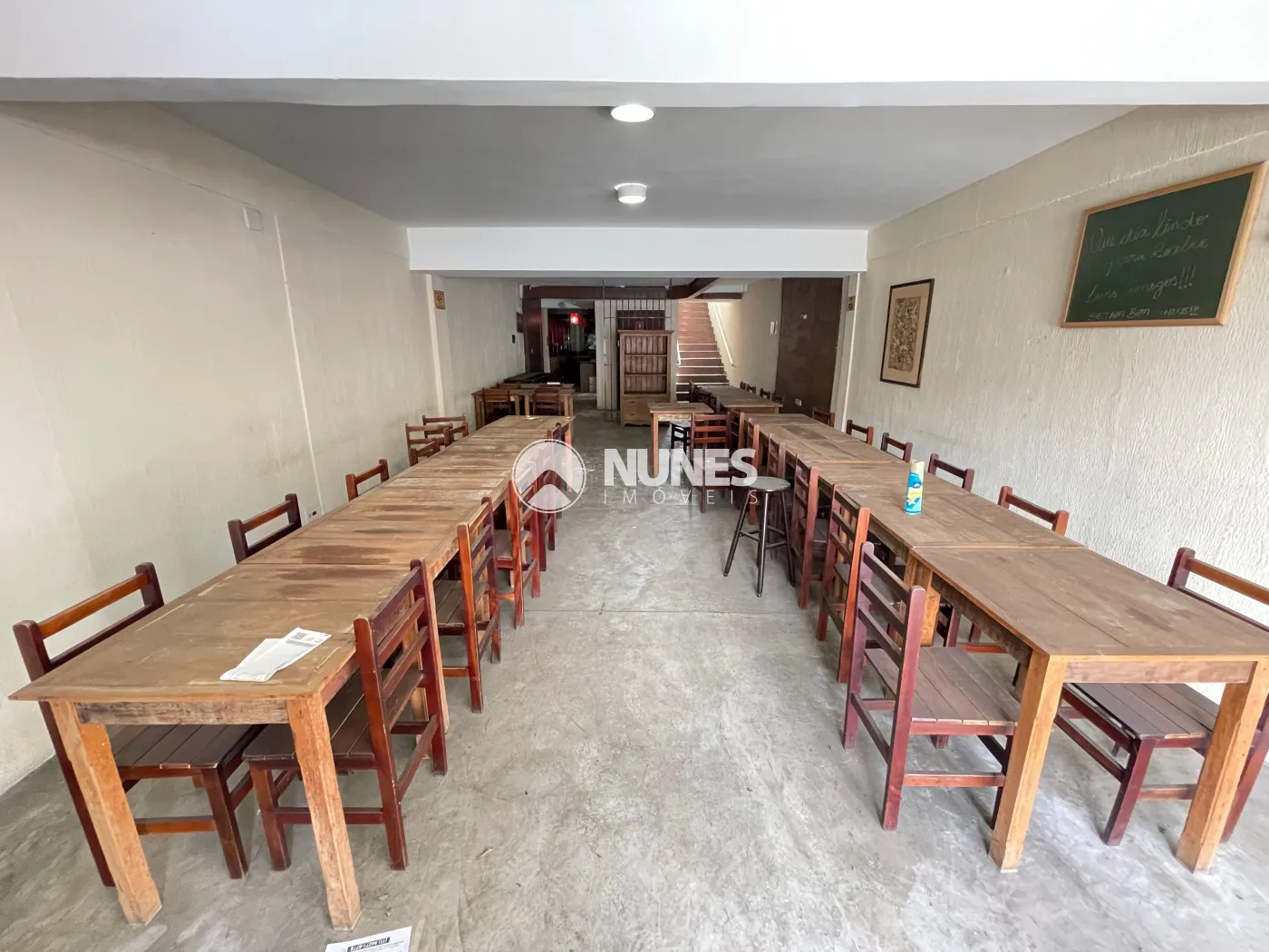 Salão da frente 58,45m² com mesas e cadeiras (piso cimento)