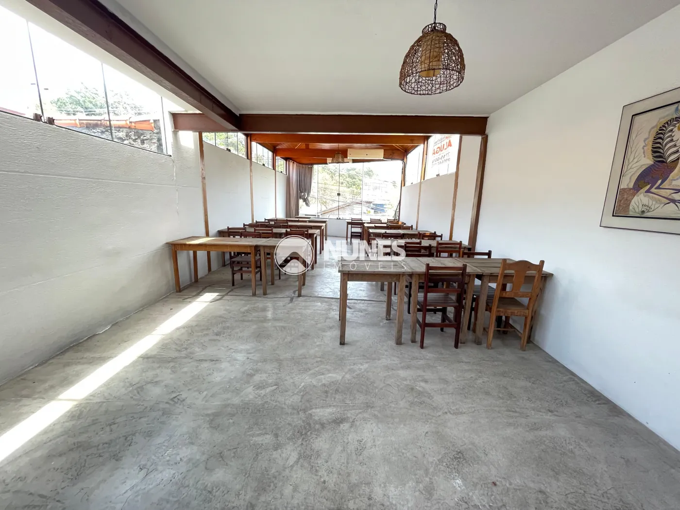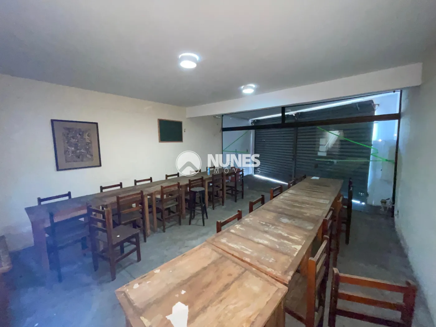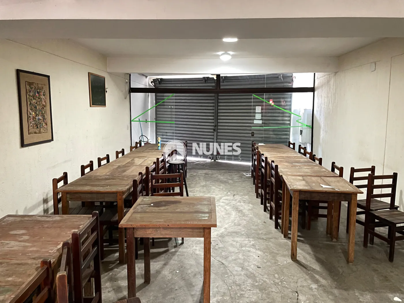 Salão da frente 58,45m² com mesas e cadeiras (piso cimento)