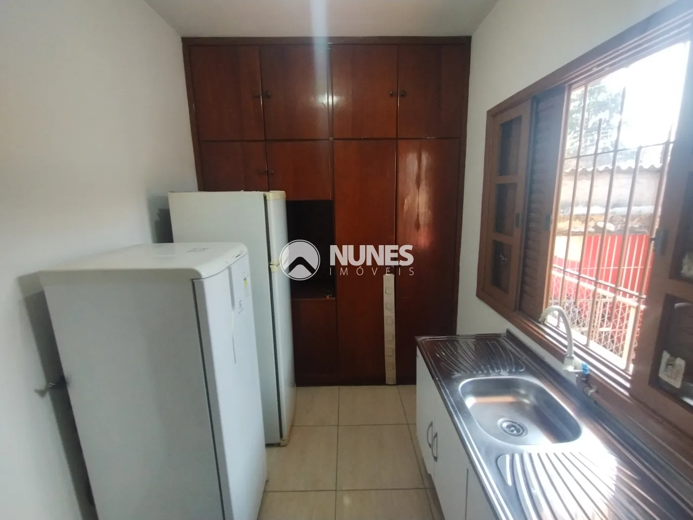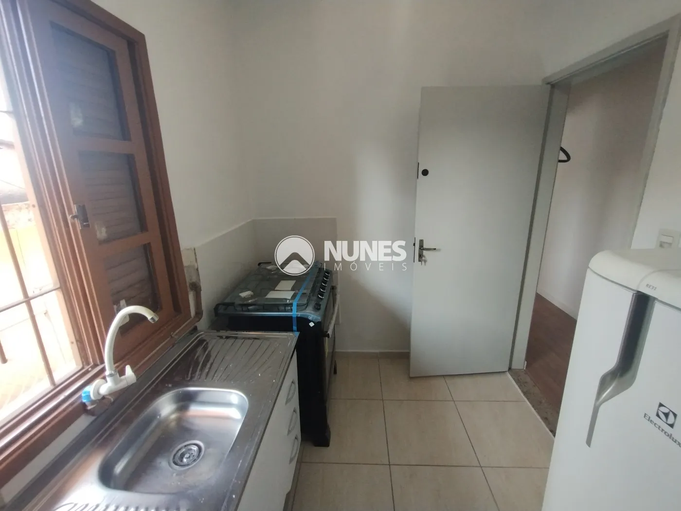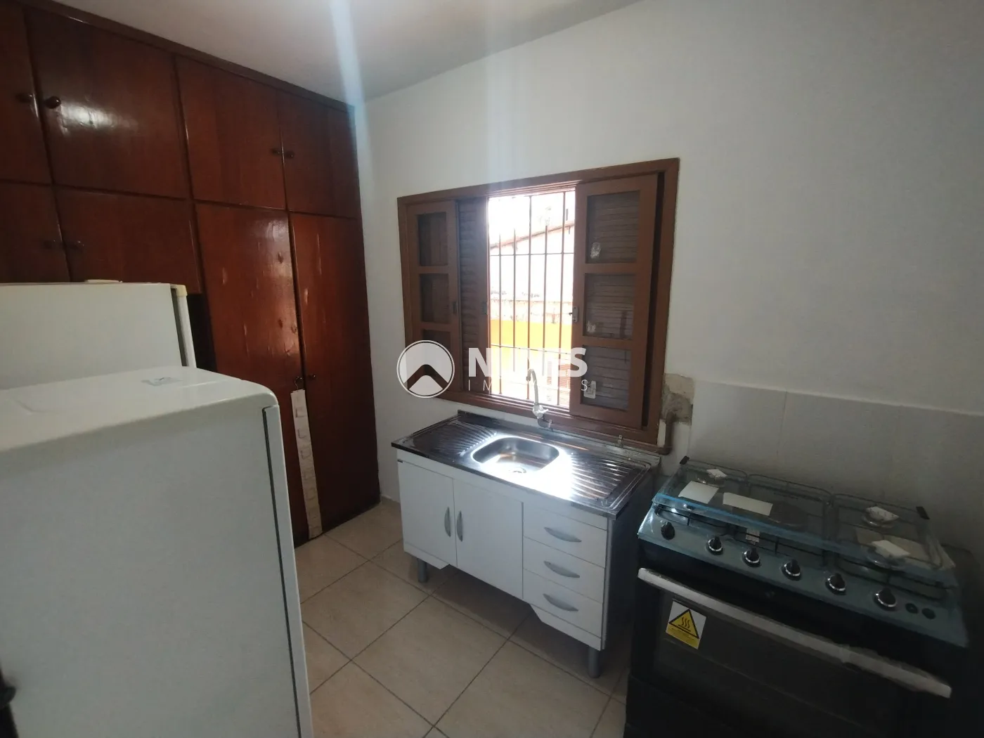 Cozinha com armário, fogão e geladeira (piso cerâmica)