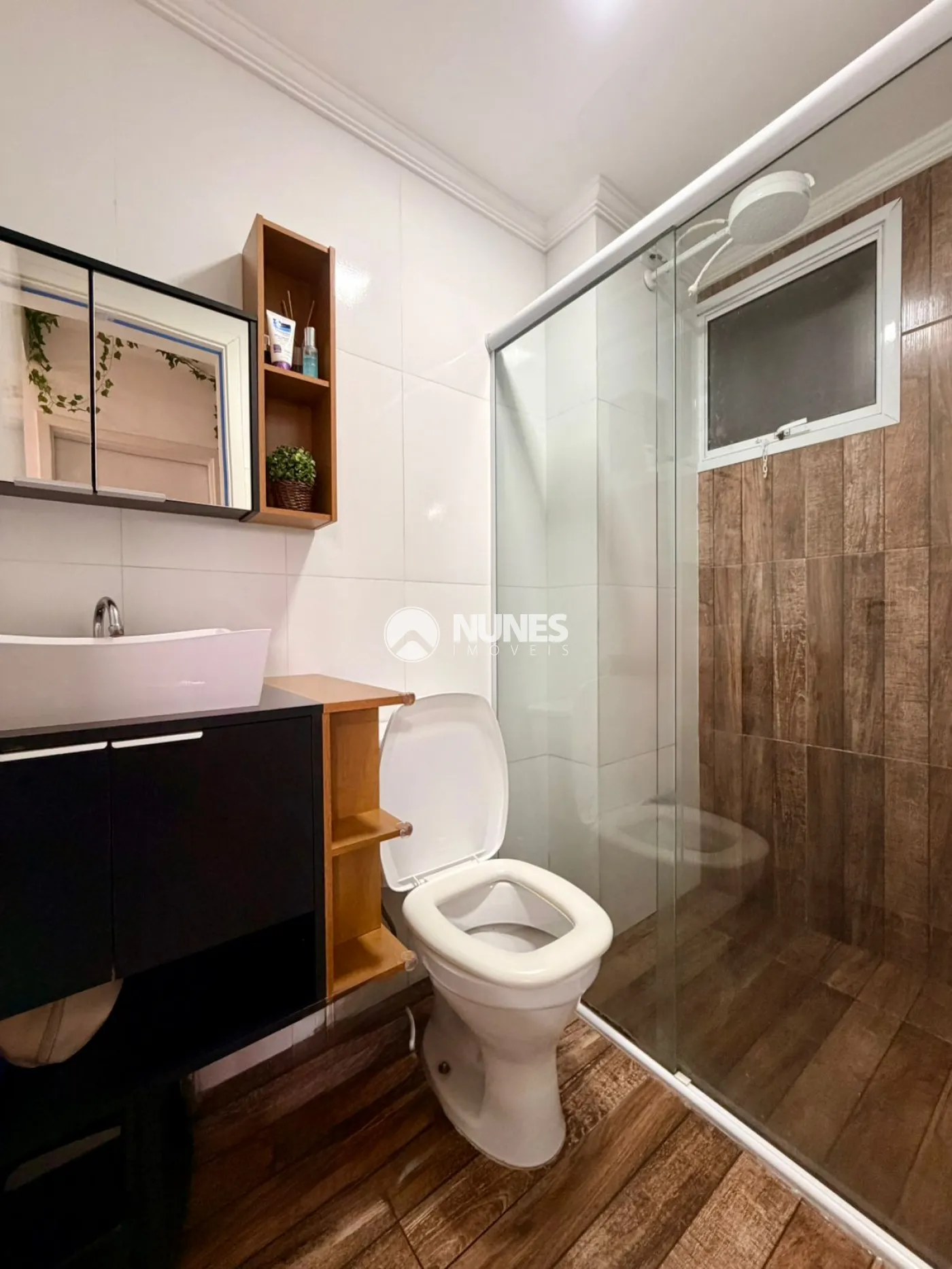 Banheiro equipado com móvel planejado e box de vidro