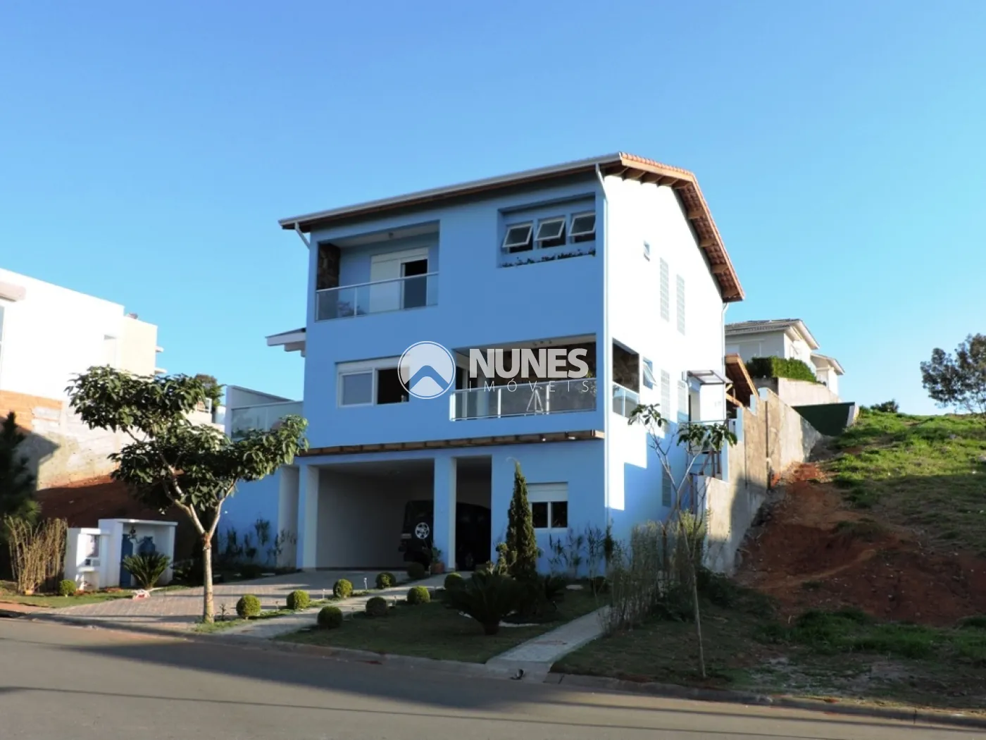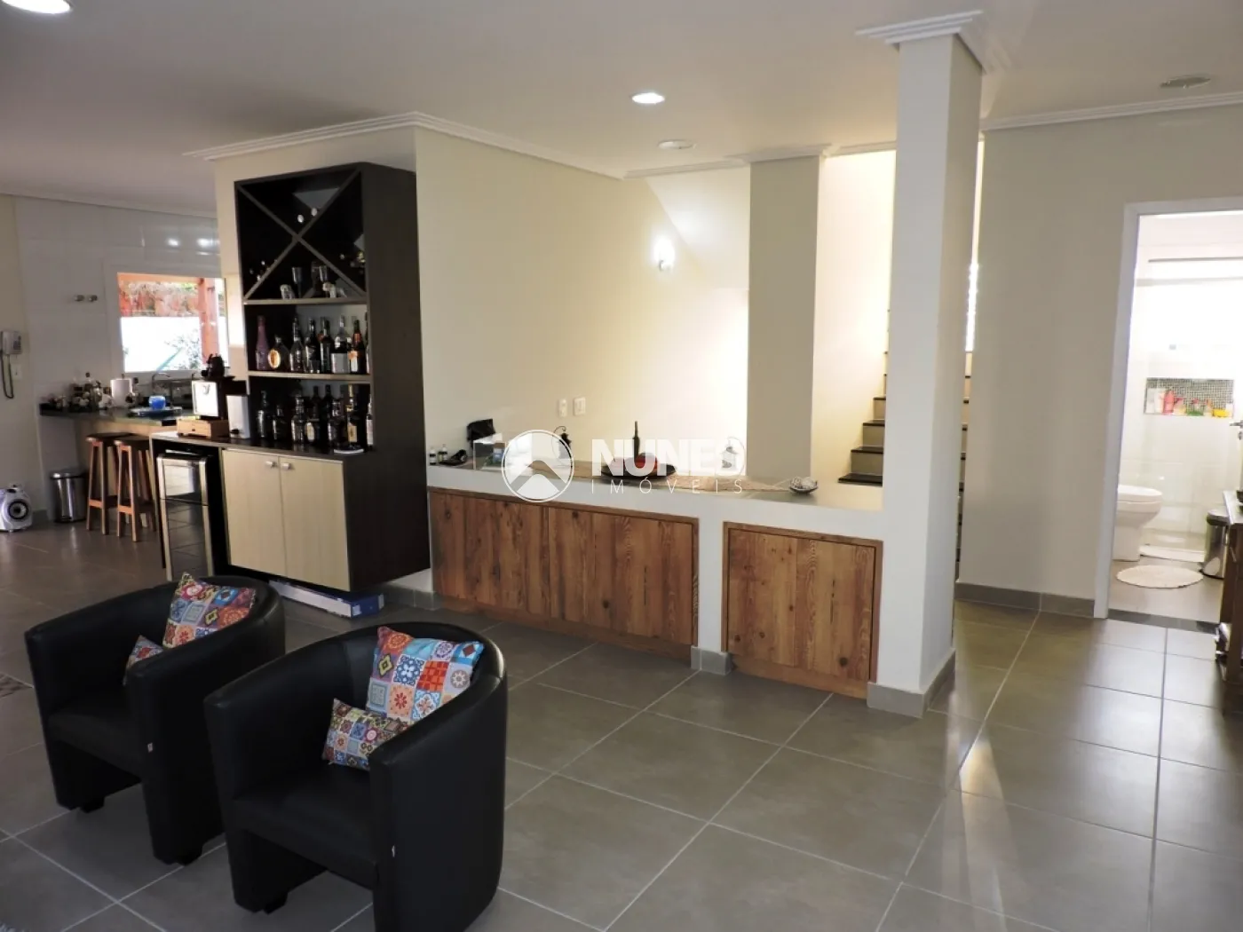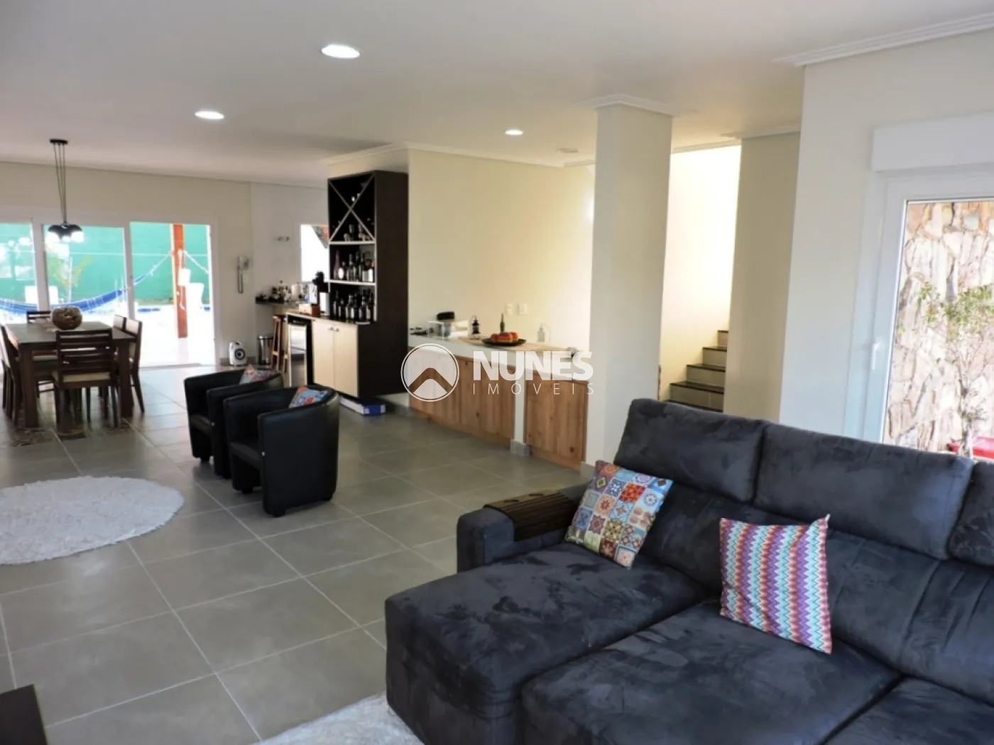 PISO INFERIOR: Sala com 3 ambientes, sala de TV com varanda (vista eterna), banheiro social (completo - com chuveiro), salas de estar, com lareira a gás, sala de jantar, integradas, com cozinha e área gourmet, pisos em porcelanato, esquadrias e portas de PVC, cozinha com armários planejados e mármore, ampla janela, ampla despensa, lavanderia com armários.