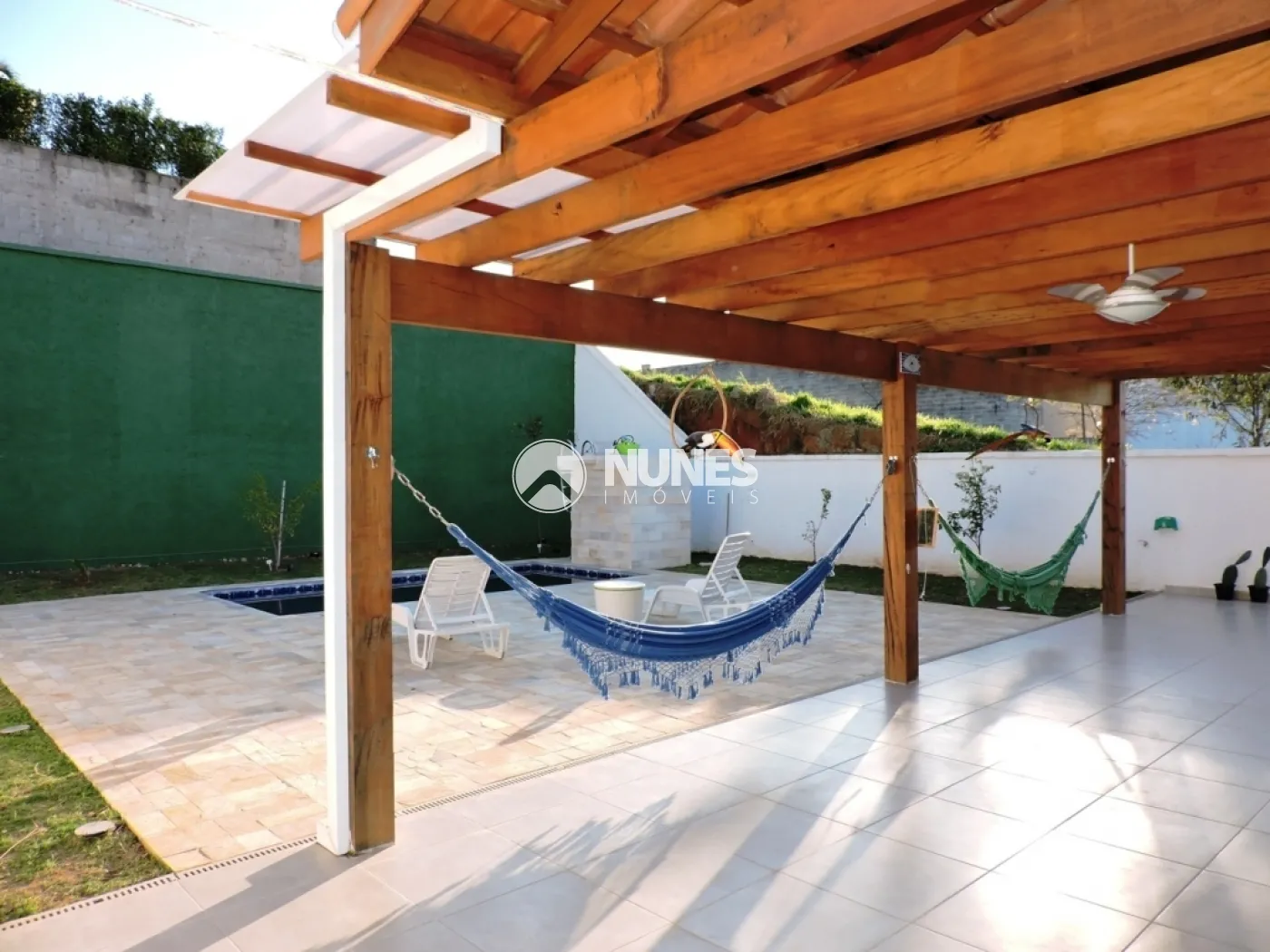Quintal ensolarado, piscina de 7 metros de comprimento com cascata, pedra na área da piscina, árvores frutíferas produzindo como: acerola, maçã, limão, carambola, quintal lateral, totalmente fechado com ralos lineares e ponto de água o que facilita na criação de animais domésticos.
