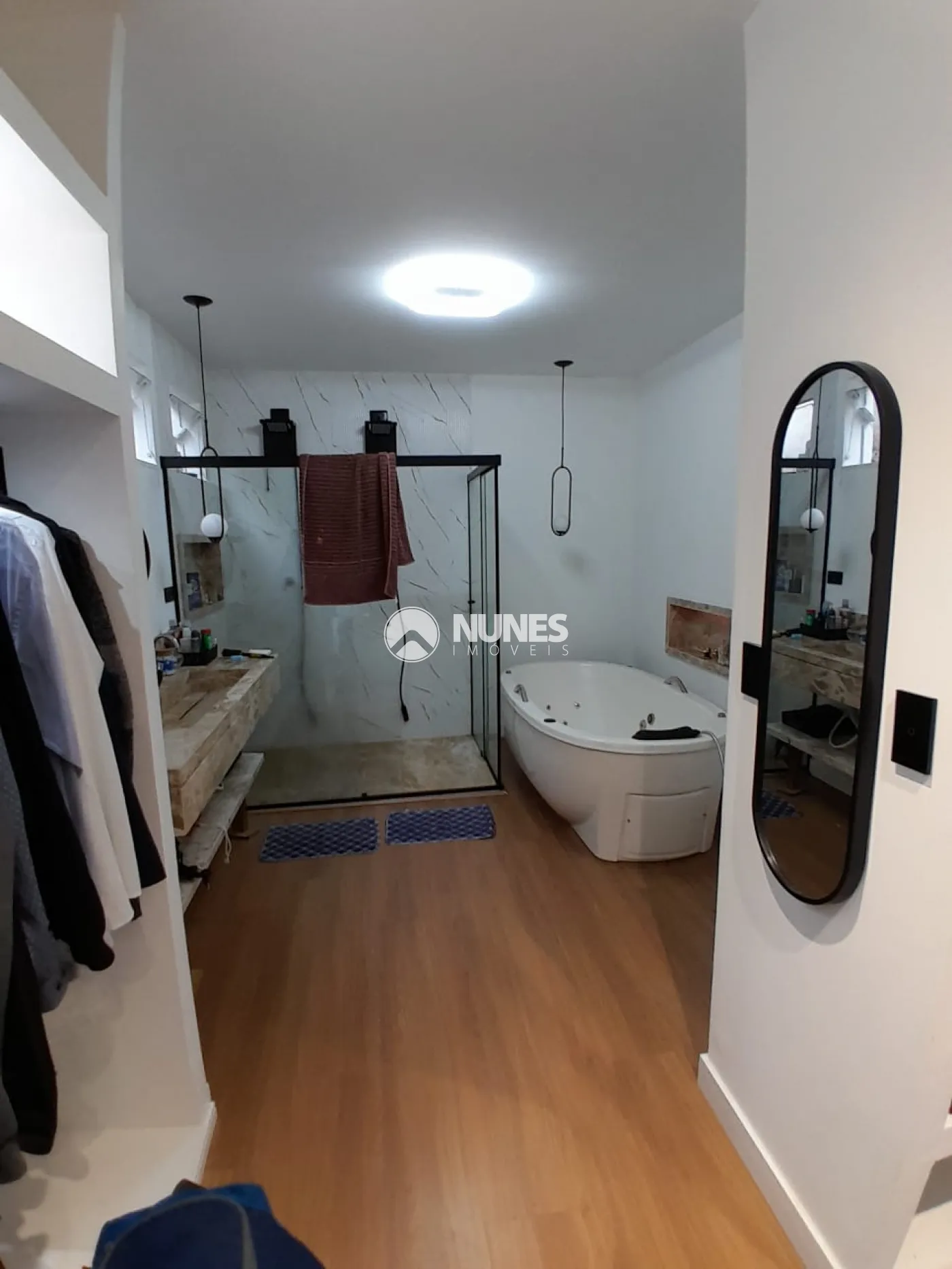 Banheiro da suíte equipado com banheira de hidromassagem aquecida, bidê aquecido, dois chuveiros e cuba dupla.