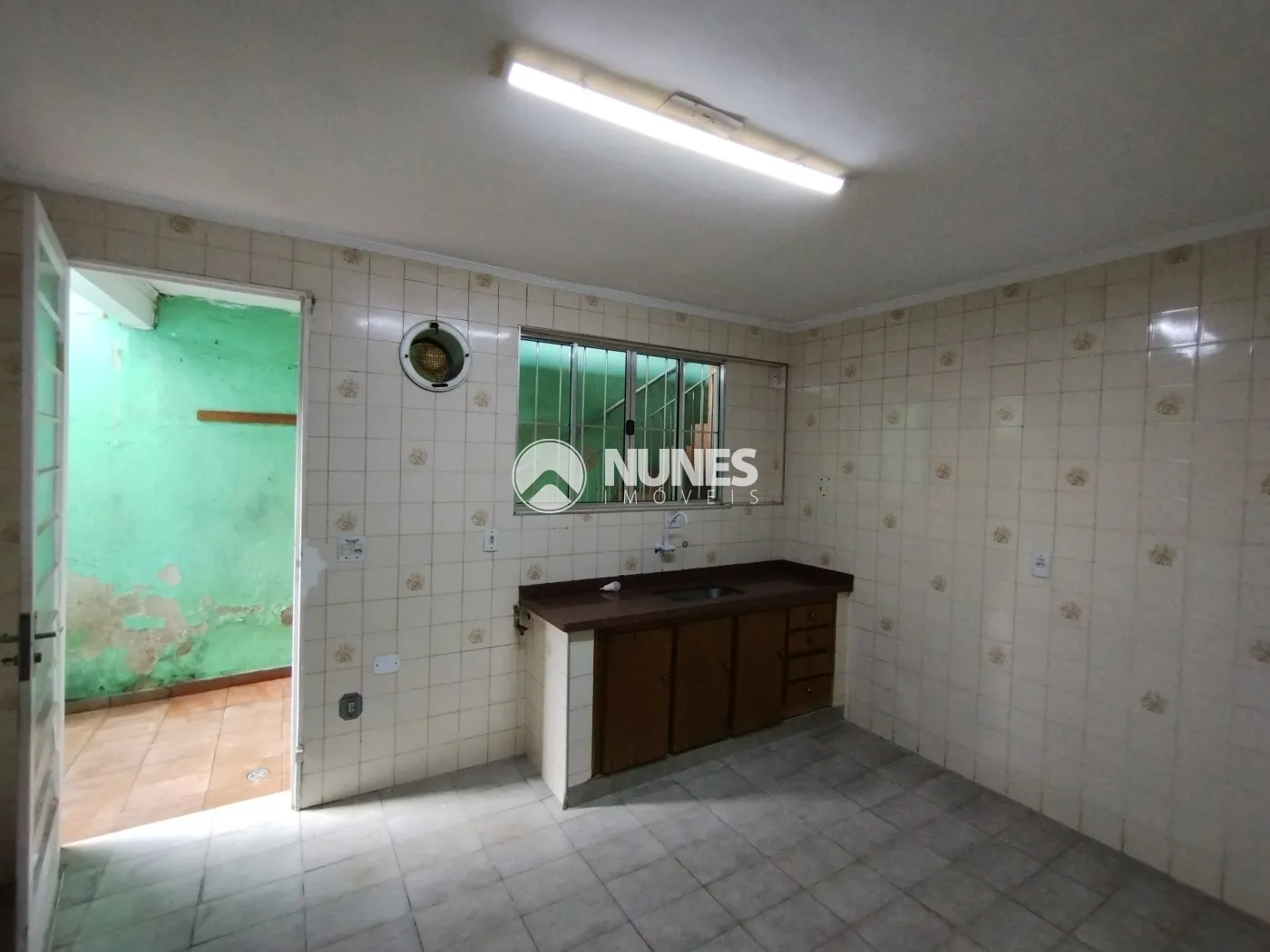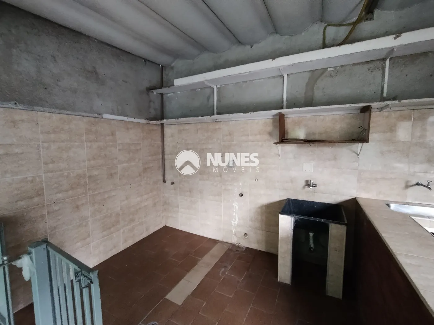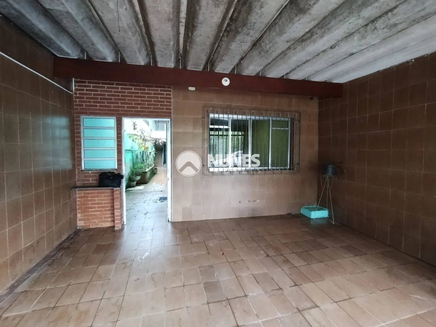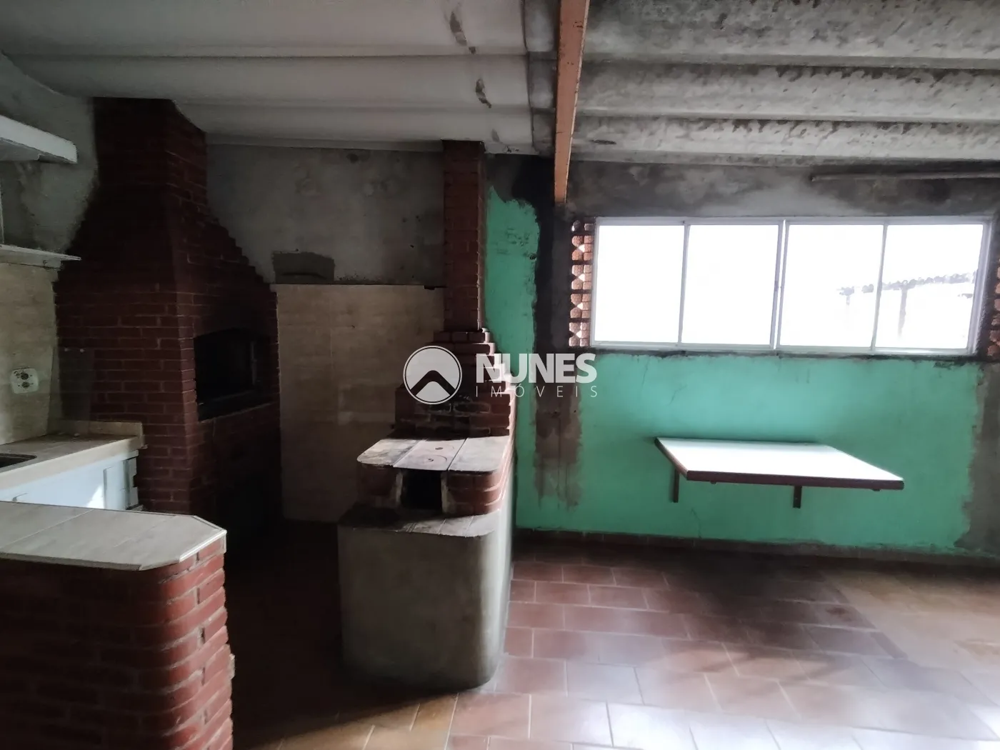 Área de serviço ampla (piso cerâmica) com churrasqueira e armário