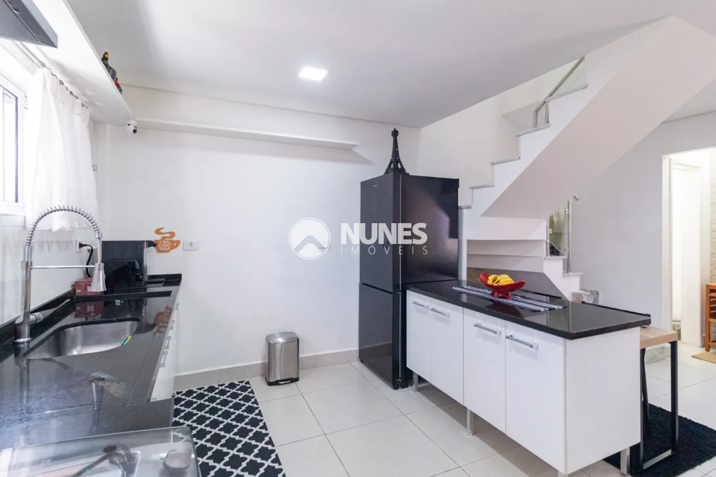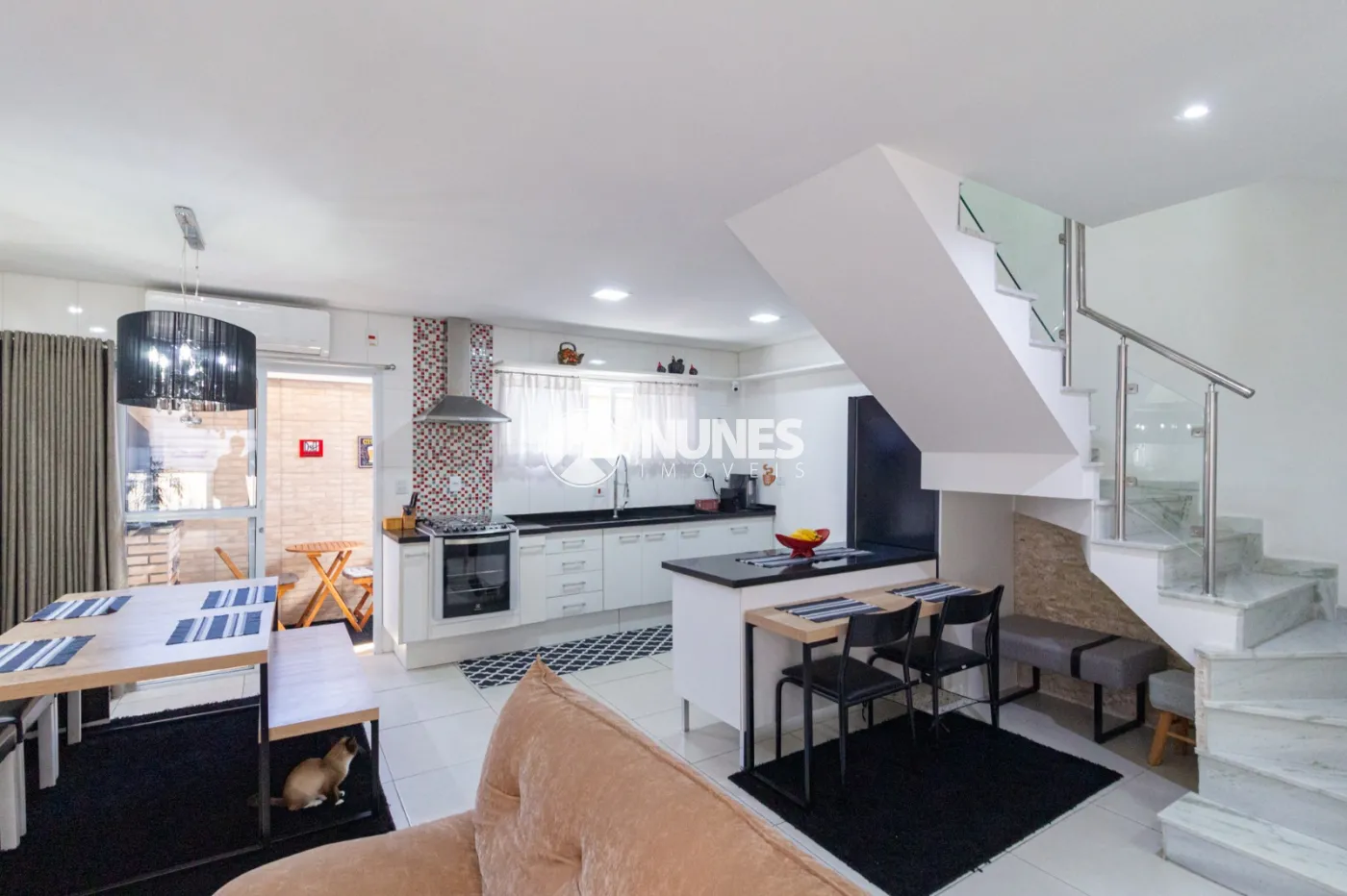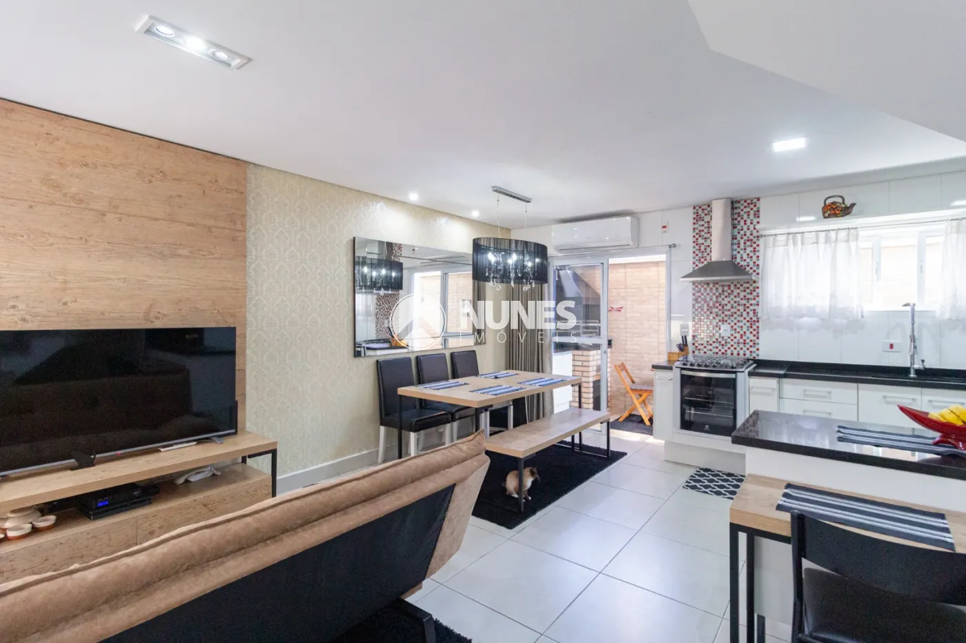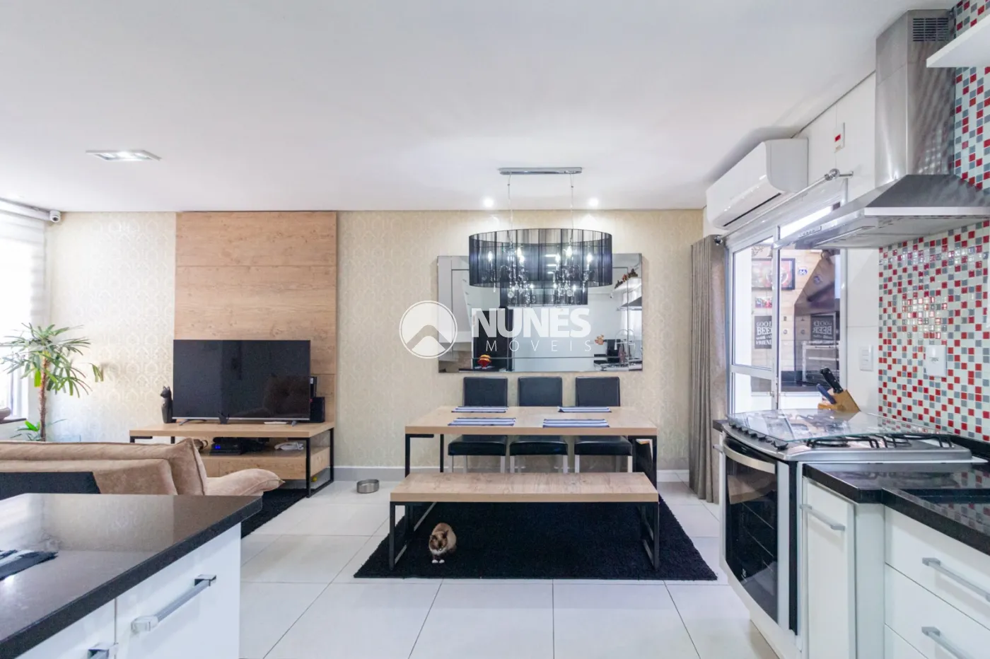 Sala 2 ambientes integrada com cozinha com móveis planejados e torneira aquecida,