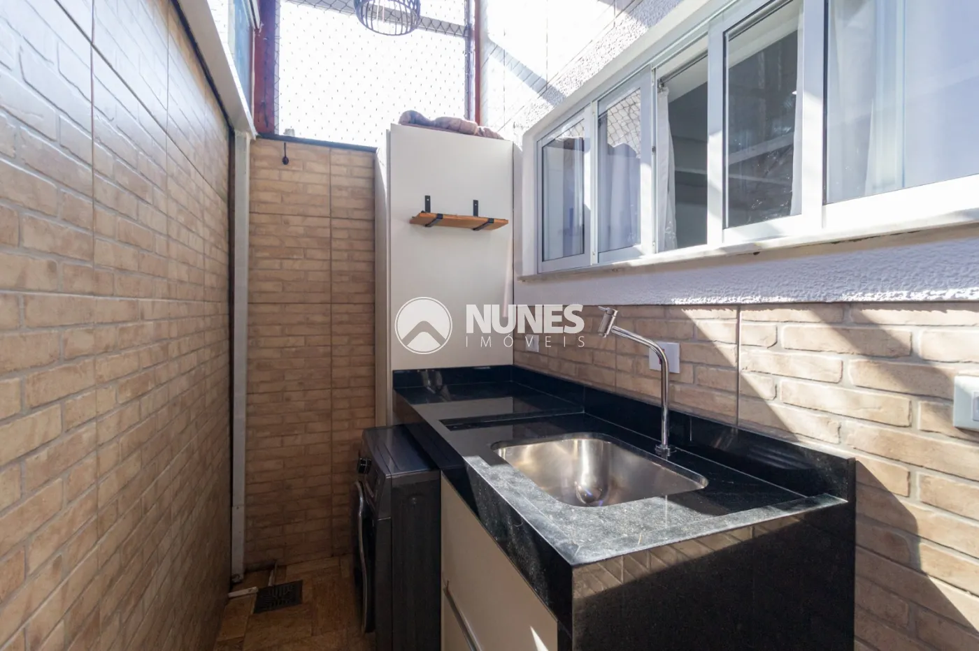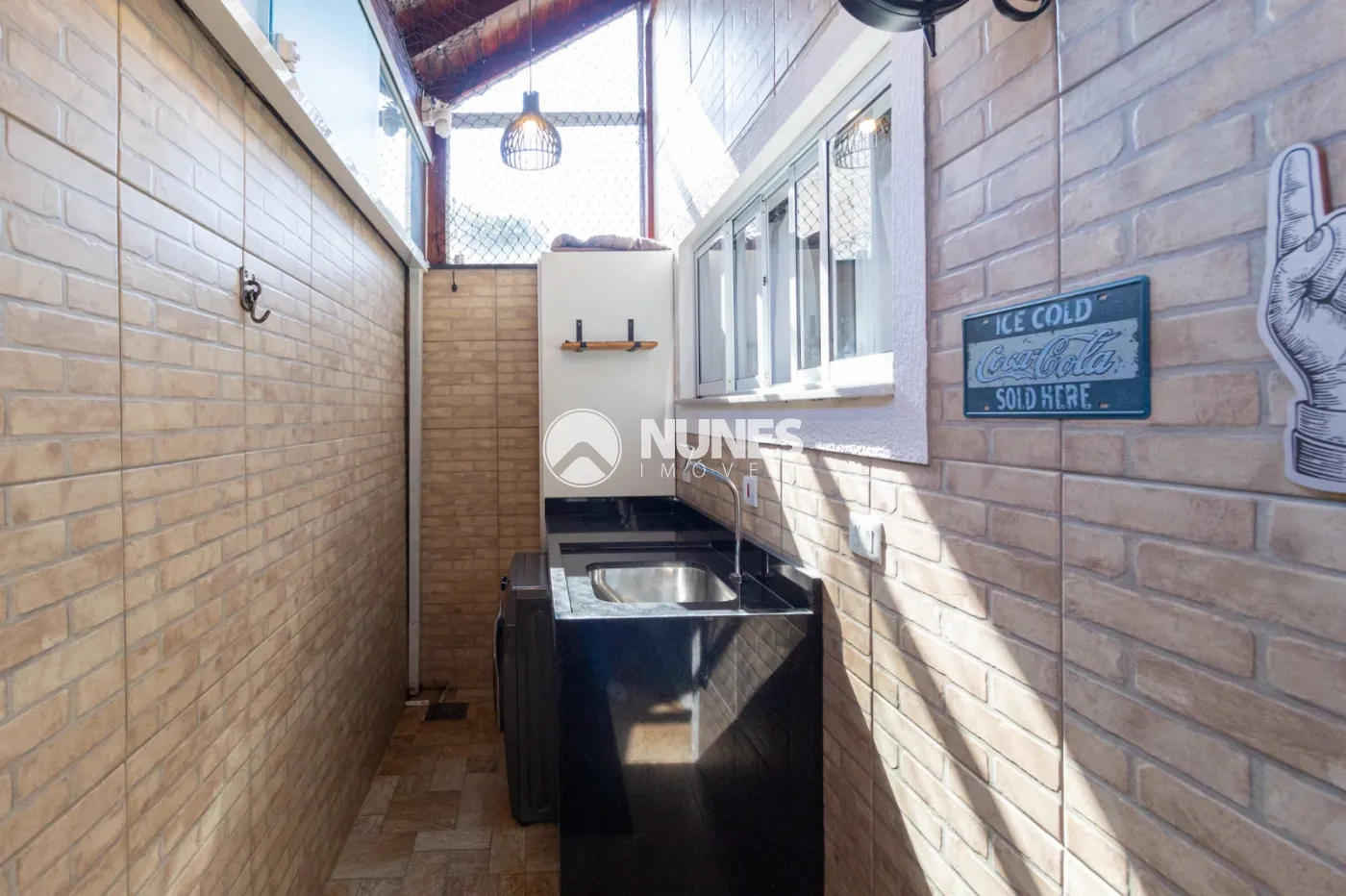 Área de serviço toda coberta, fechamento em vidro com churrasqueira e acabamento em pedras.