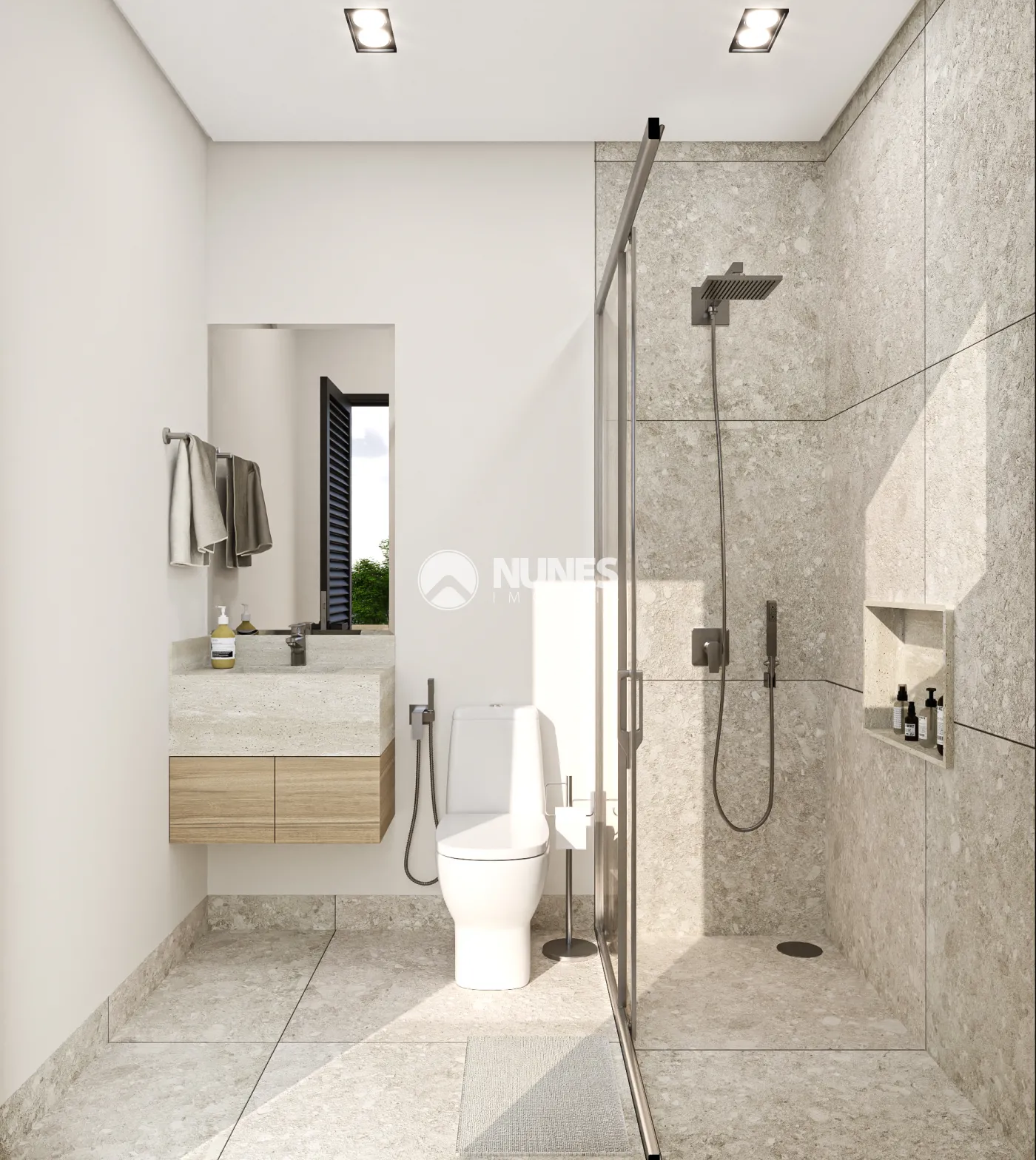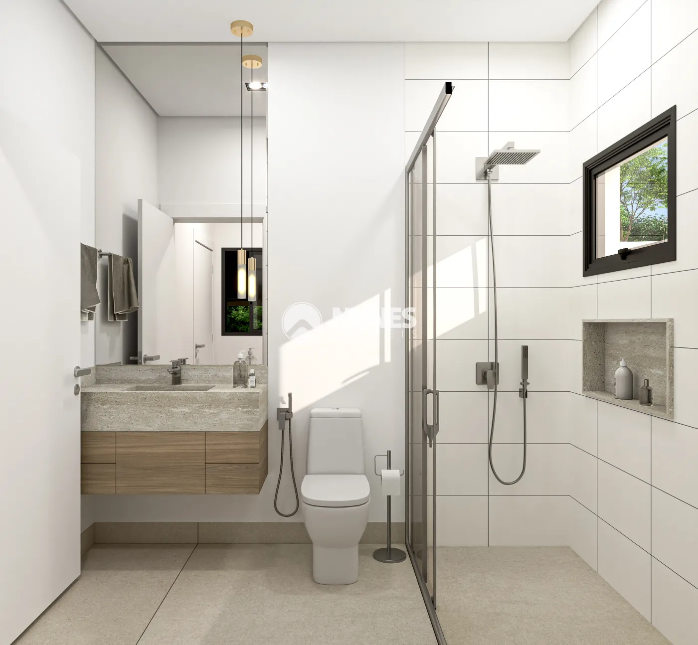 2) Piso térreo e garagem com porcelanto 1,23 x 1,23m interno e externo Renascence.